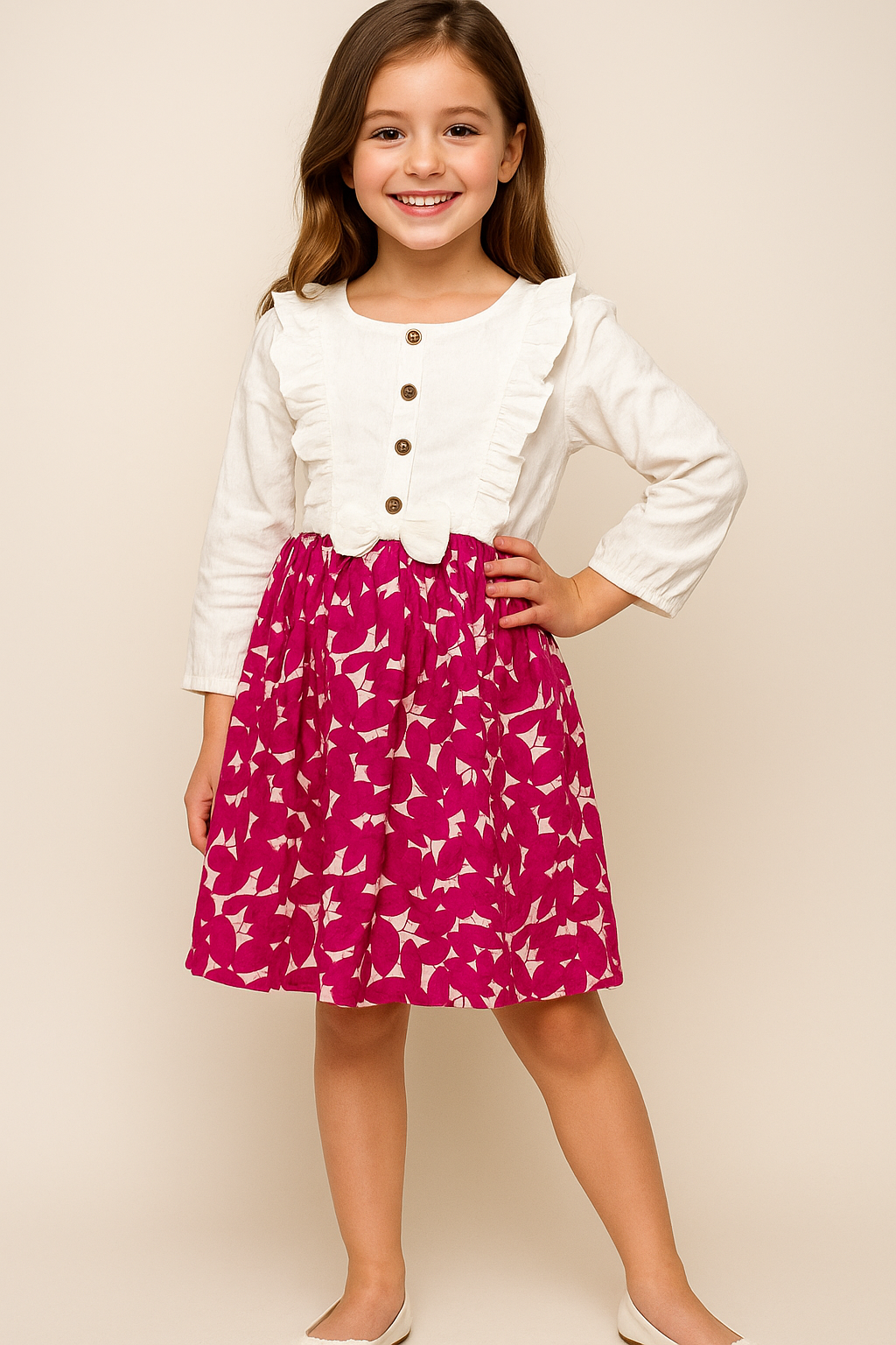 Dress your little princess in charm with our Girls’ Cream & Magenta Printed Dress, designed to bring together elegance and playfulness. The top features a soft cream bodice with ruffle details, front button closure, and a cute bow accent at the waist, flowing into a vibrant magenta skirt with bold abstract prints.