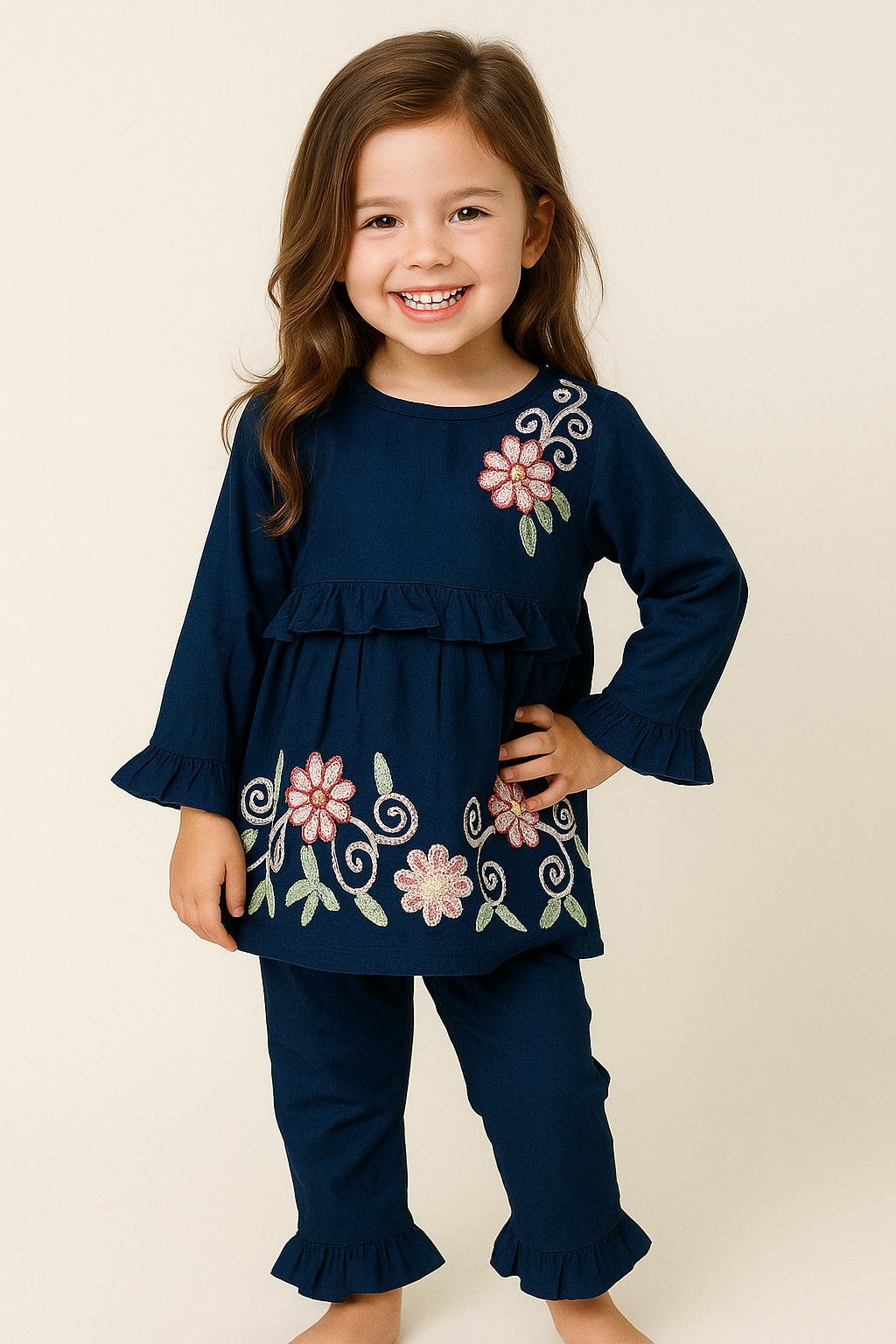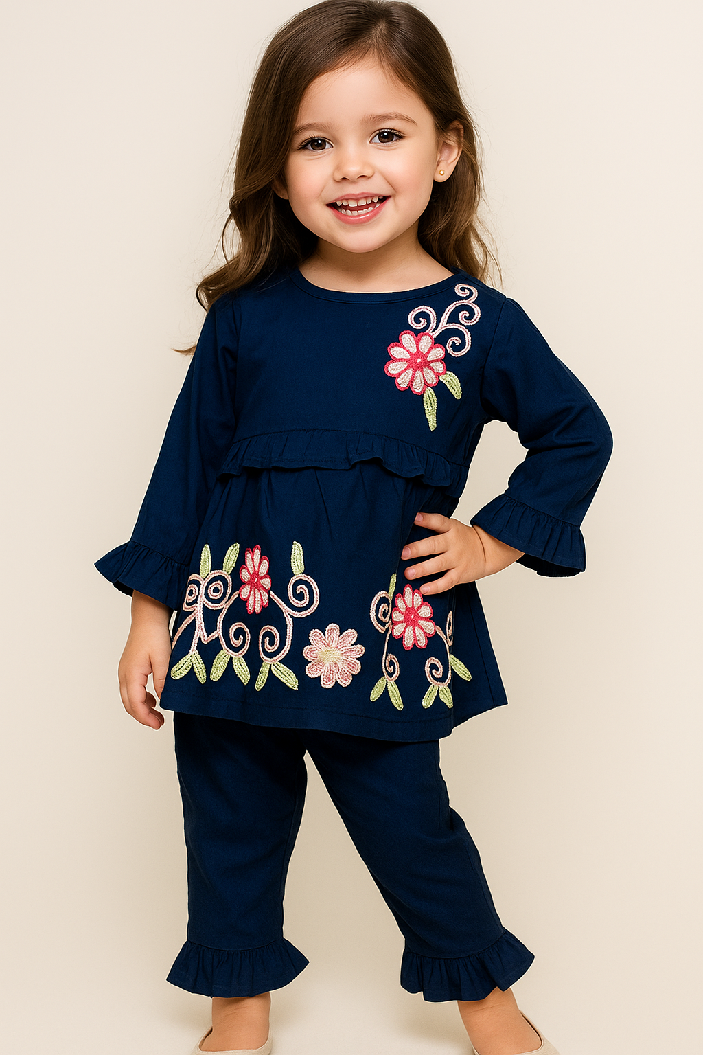 Dress your little one in elegance with our Girls’ Embroidered Cotton Kurti & Pant Set, designed for comfort and charm. Crafted from premium-quality cotton fabric, this two-piece outfit features a soft white kurti with delicate floral embroidery and ruffled sleeves, paired with matching pants that have frilled hems for an adorable touch.