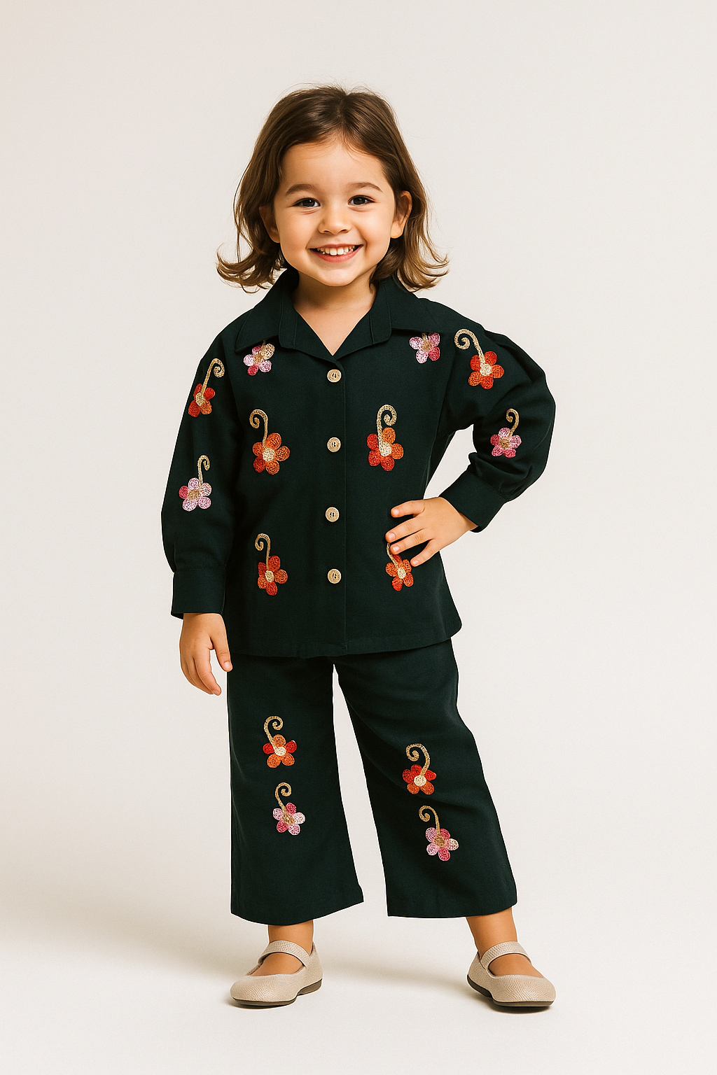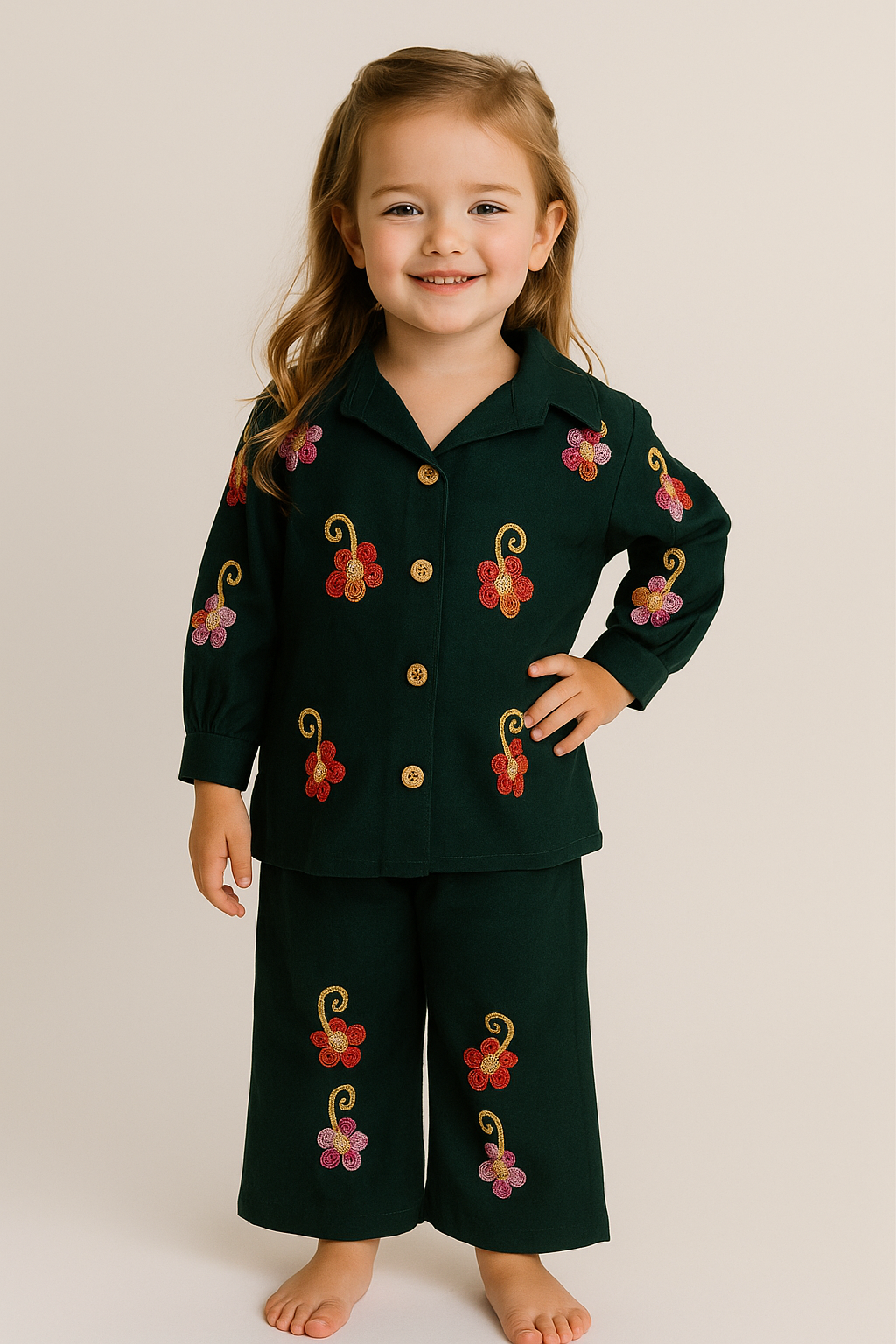 Brighten up your little one’s wardrobe with this Bottle Green floral embroidered co-ord set for girls. Crafted from premium cotton, this stylish two-piece features a button-down shirt with a collared neckline and matching wide-leg pants. The outfit is adorned with playful pink and brown floral embroidery, adding a cheerful charm to the elegant white base.