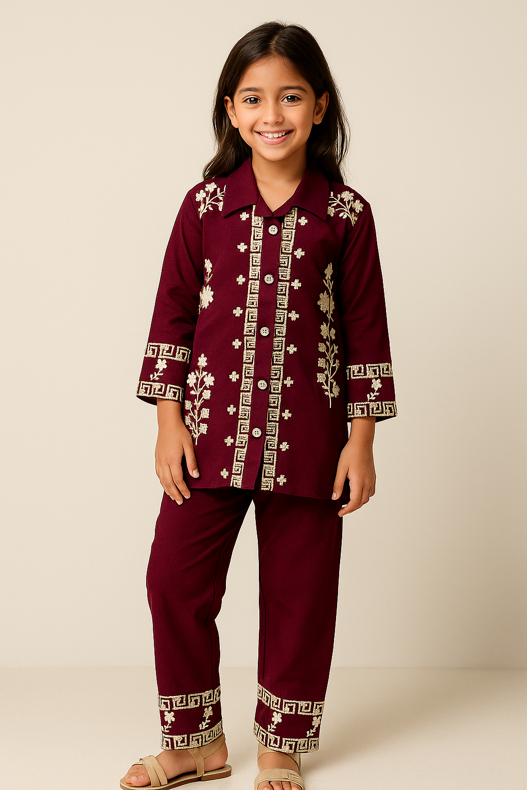 Girls Maroon Embroidered Kurti Set – Elegant Festive & Party Wear for 5–15 Years