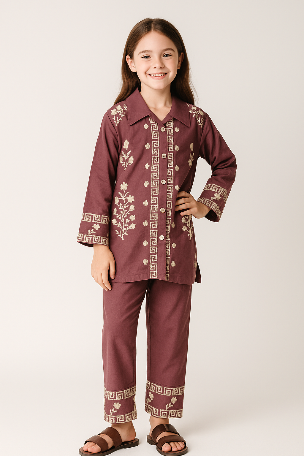 The set includes a full-sleeve kurti with a classic shirt collar and matching straight-fit pants, both featuring detailed embroidery for a coordinated, stylish look. Perfect for weddings, festivals, family functions, and special occasions, this outfit ensures your girl stands out with grace and sophistication.