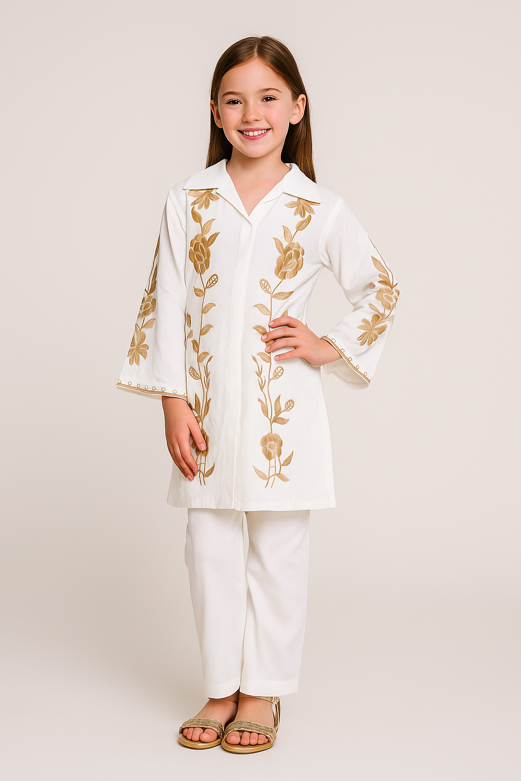 Give your little girl’s wardrobe a festive upgrade with this White embroidered kurti set, crafted for elegance and comfort. The kurti features intricate golden floral embroidery on the front and sleeves, paired with straight-fit matching pants for a graceful and coordinated look. The collared neckline and flared sleeves add a modern twist to this traditional design.