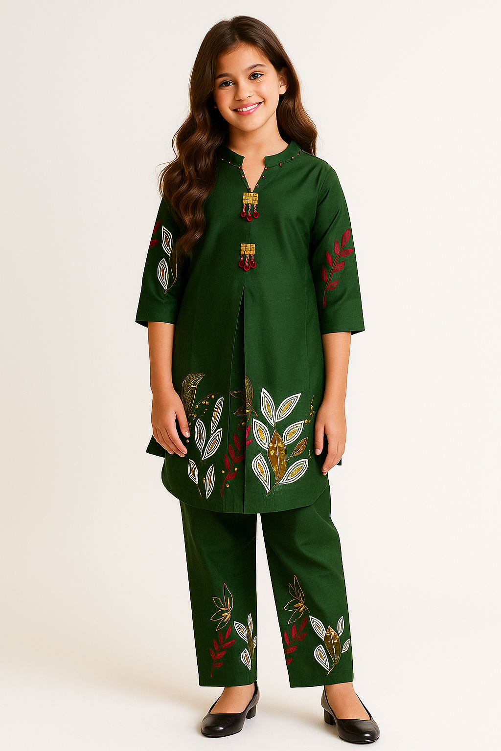 Add a splash of elegance to your childβs festive wardrobe with this dark green embroidered kurti and pants set from House of IQF. The rich green tone is beautifully enhanced with leaf-inspired multicolor embroidery in mustard, white, and red, giving the outfit a vibrant and stylish appeal.
