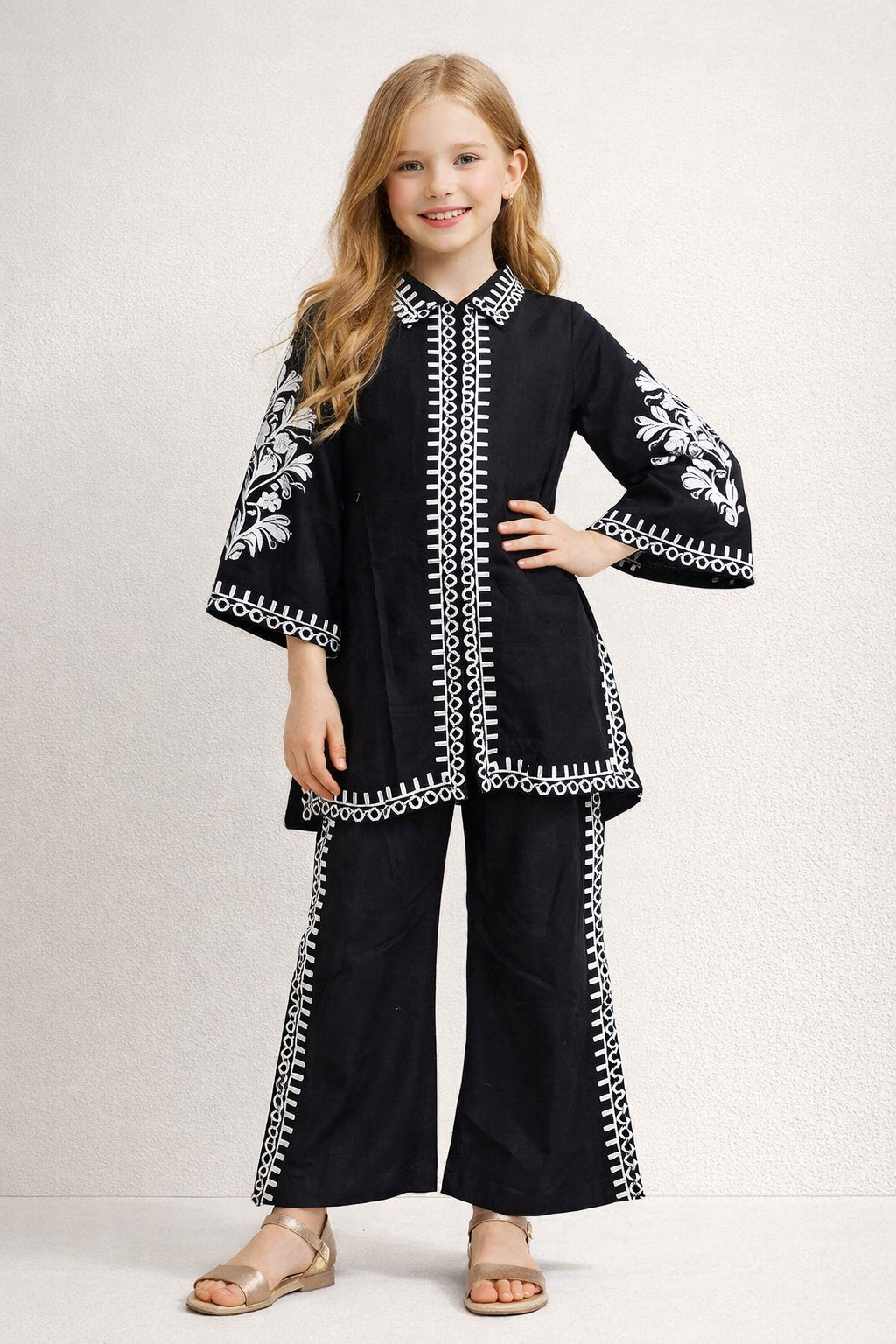 Make a bold yet timeless style statement with this girls black embroidered kurti co-ord set, designed for effortless elegance and everyday comfort. Crafted from soft, breathable premium fabric, this outfit is lightweight, skin-friendly, and perfect for long wear.