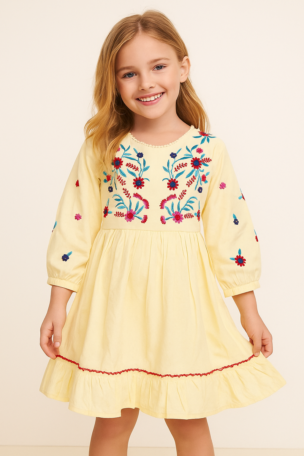 Add charm to your little one’s wardrobe with our beautifully crafted cream embroidered cotton dress. Designed for girls aged 3 to 10 years, this full-sleeve dress features intricate multicolor floral embroidery on the yoke and sleeves, creating a perfect blend of tradition and trend. The soft cotton fabric ensures all-day comfort, while the flared hem with subtle ruffles adds a playful touch. Ideal for festive occasions, casual outings, or family gatherings.