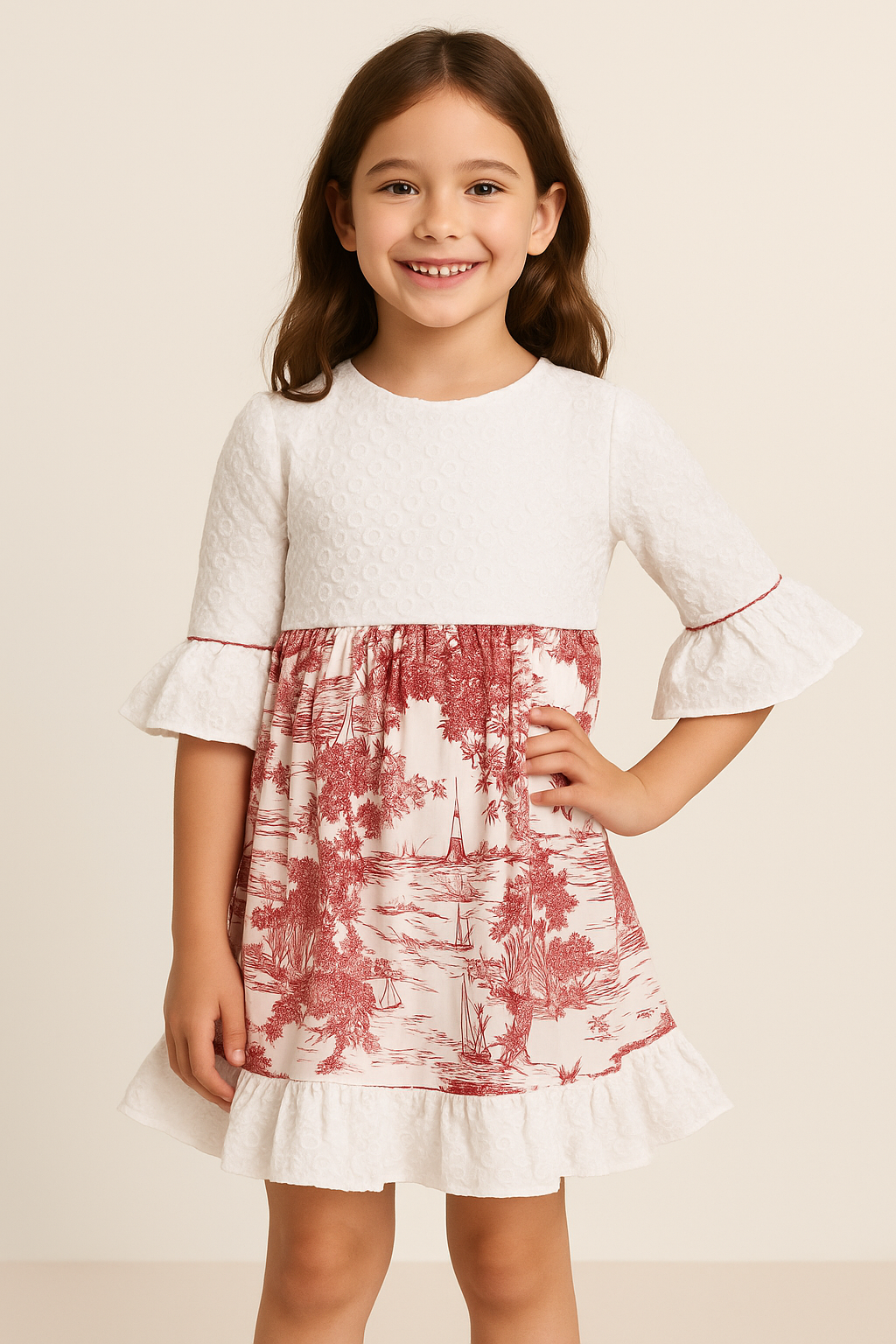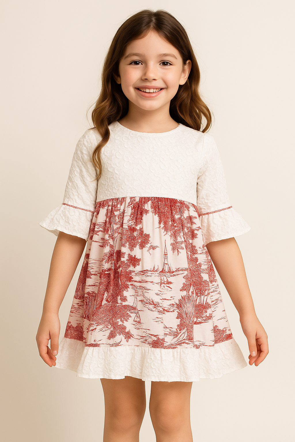Grace meets comfort in our Vintage Bloom White Floral Dress – a delightful addition to your little girl’s wardrobe. This charming knee-length dress features a textured white bodice with soft ruffle sleeves, perfectly paired with a floral-printed skirt in warm tones of white and pink. The gathered empire waist gives it a flattering silhouette while ensuring ease of movement.