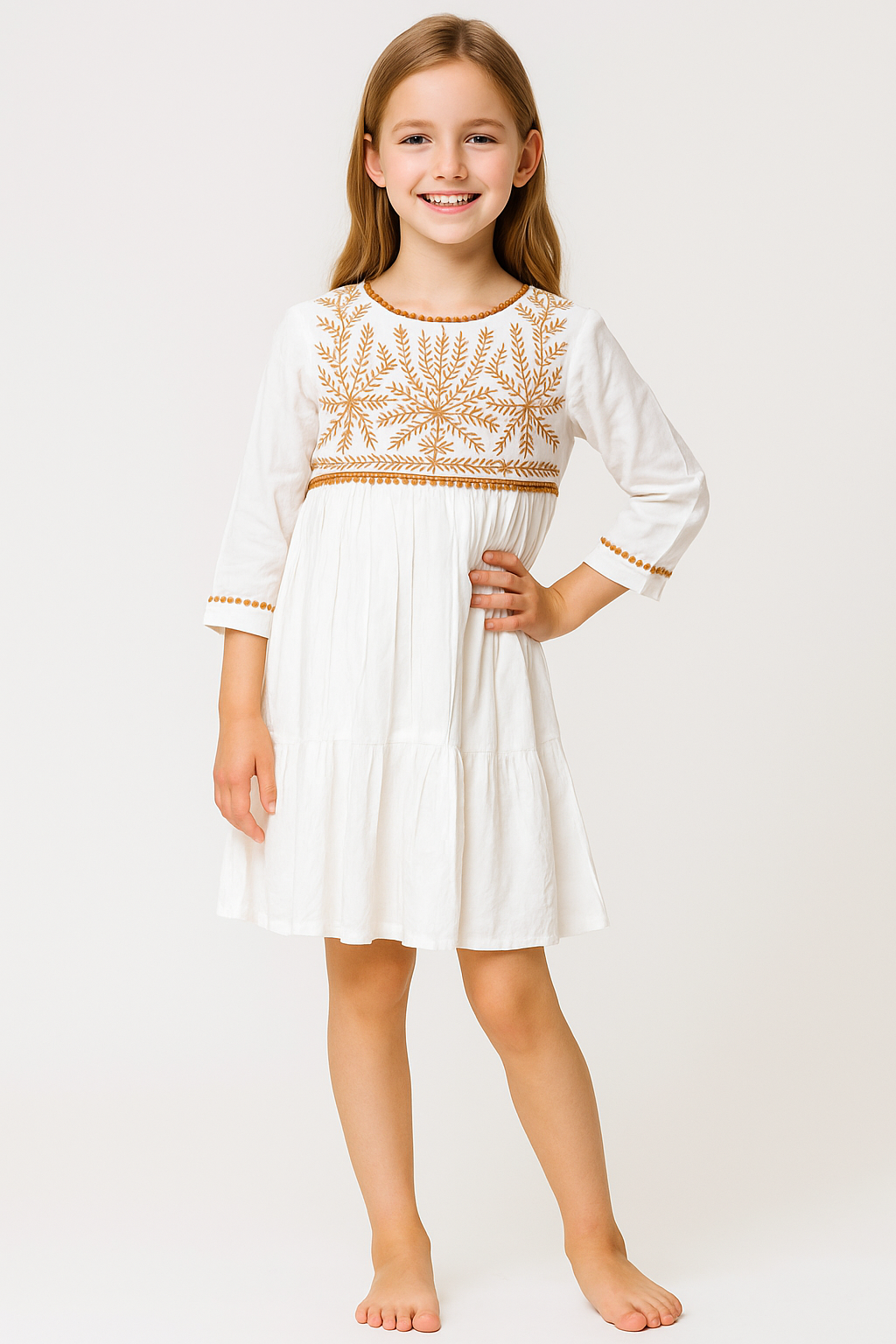 Elevate your little one's everyday elegance with this Cream Flared Cotton Dress, beautifully designed for girls aged 1 to 12 years. Featuring intricate white embroidery in a symmetrical foliage pattern on the yoke and sleeves, this dress blends ethnic charm with modern simplicity. The soft, breathable cotton fabric and gathered waist ensure maximum comfort and movement throughout the day.