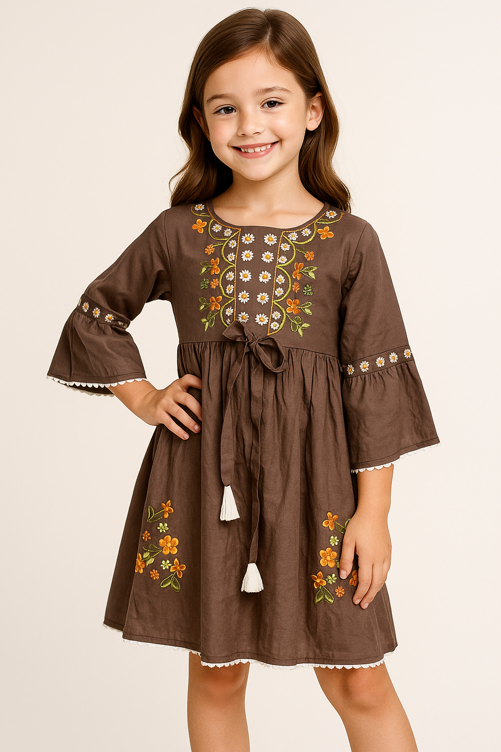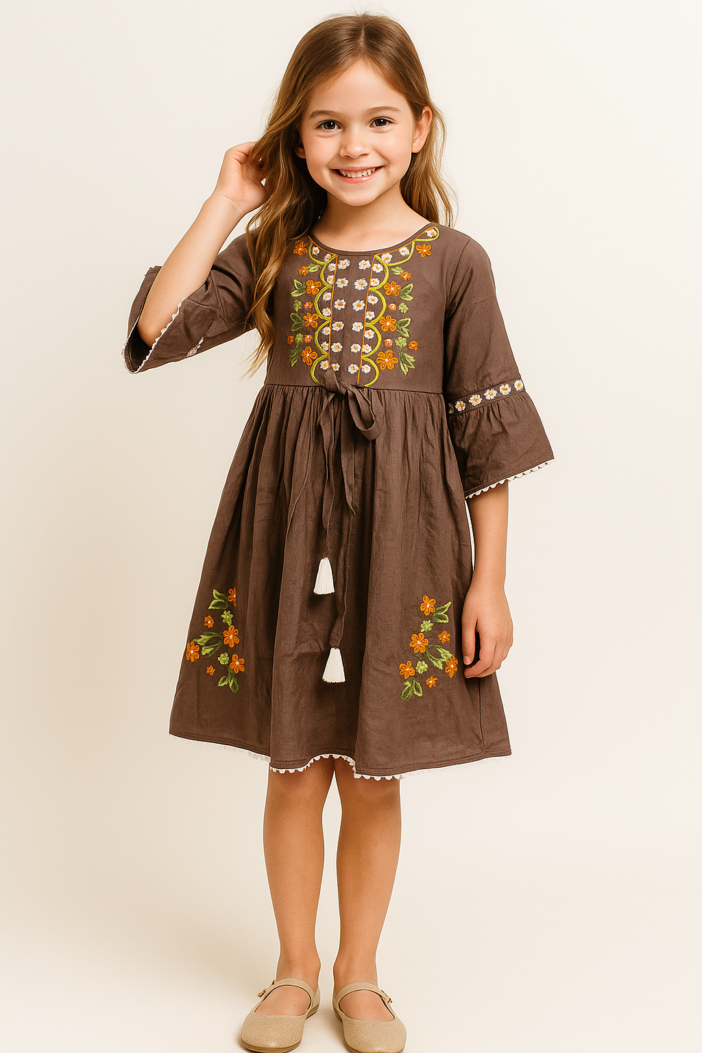 Add a splash of color to your little one’s wardrobe with this Girls’ Brown Embroidered Cotton Dress, designed to keep her stylish and comfortable all day long. Crafted from premium breathable cotton, this dress features intricate floral embroidery on the bodice, sleeves, and hemline, paired with playful red tassels at the waist for a charming touch.