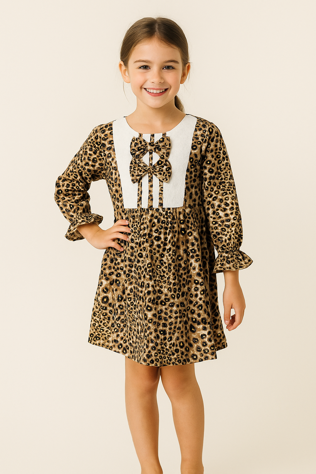 Unleash your little one’s bold style with this leopard print frock for girls, designed to turn heads at every occasion. Crafted from premium soft fabric, this frock features a playful all-over leopard print with a contrasting white yoke, accented by stylish double bow detailing and button embellishments.