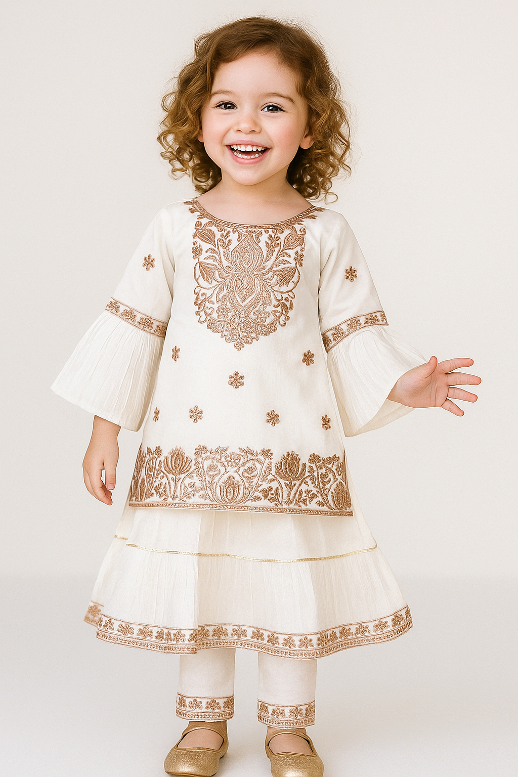 Let your little princess steal the spotlight in this dreamy ivory embroidered kurti set for baby girls, beautifully crafted by House of Iqf. This elegant ensemble features a flared kurti with intricate golden thread embroidery, layered hem detailing, and pleated bell sleeves — all designed to deliver regal charm and festive grace.