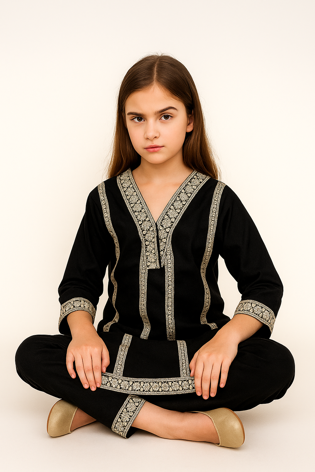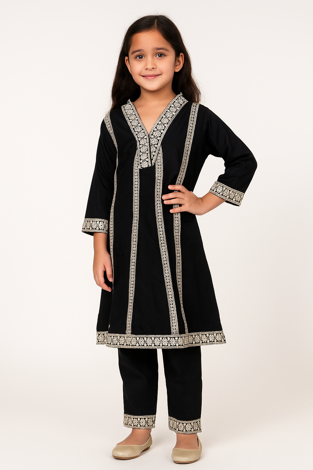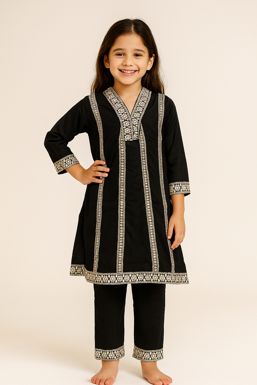 The straight-cut kurti features a deep V-neck design with embroidered panels running vertically, creating a stylish and elongated silhouette. Paired with matching pants finished with embroidered cuffs, this set is both comfortable and classy. Crafted in soft, breathable fabric, it ensures ease of wear while keeping your little one looking elegant.