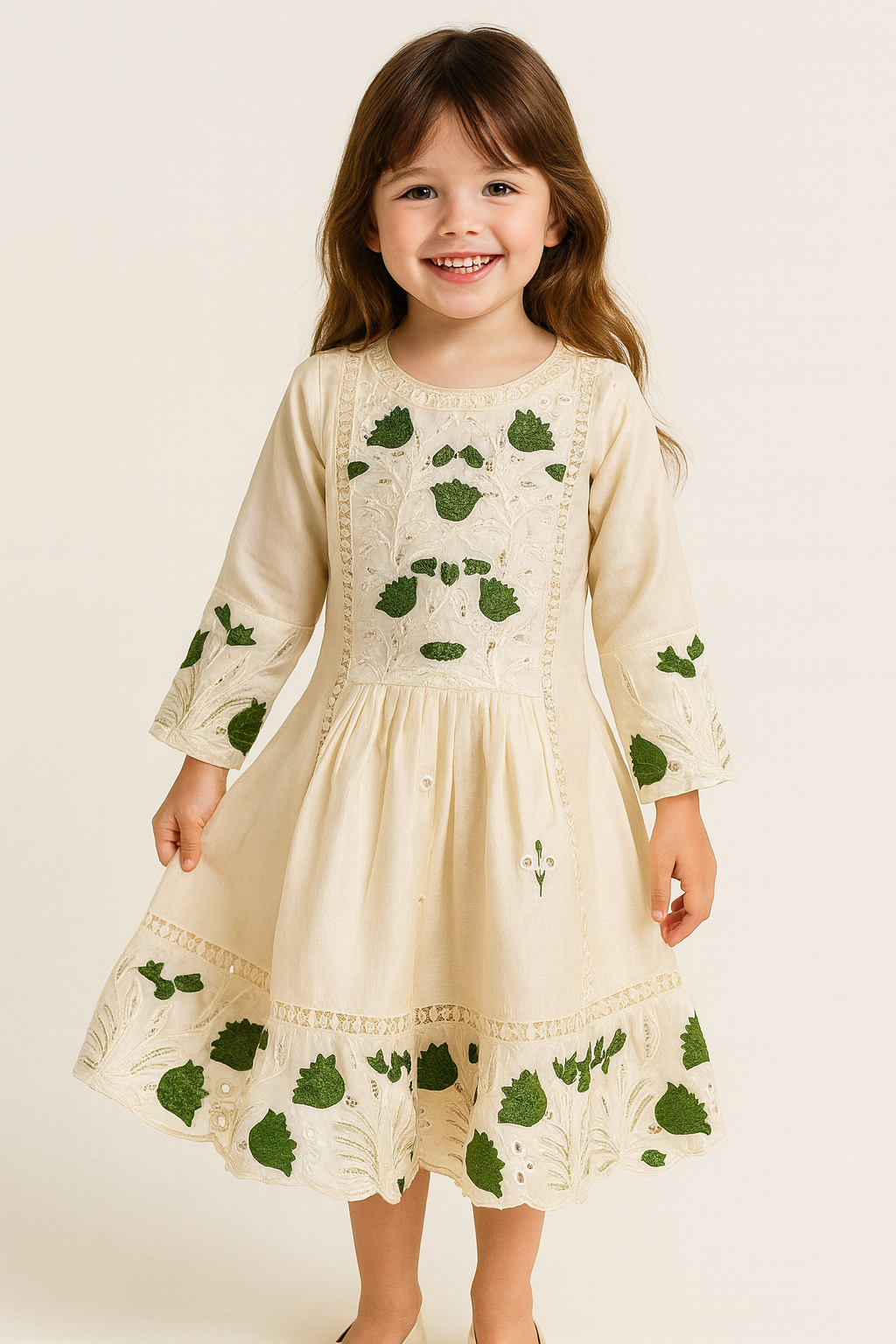 Dress your little girl in graceful charm with this embroidered cotton dress for girls, thoughtfully designed by House of IQF for moms who appreciate quality, comfort, and timeless style.