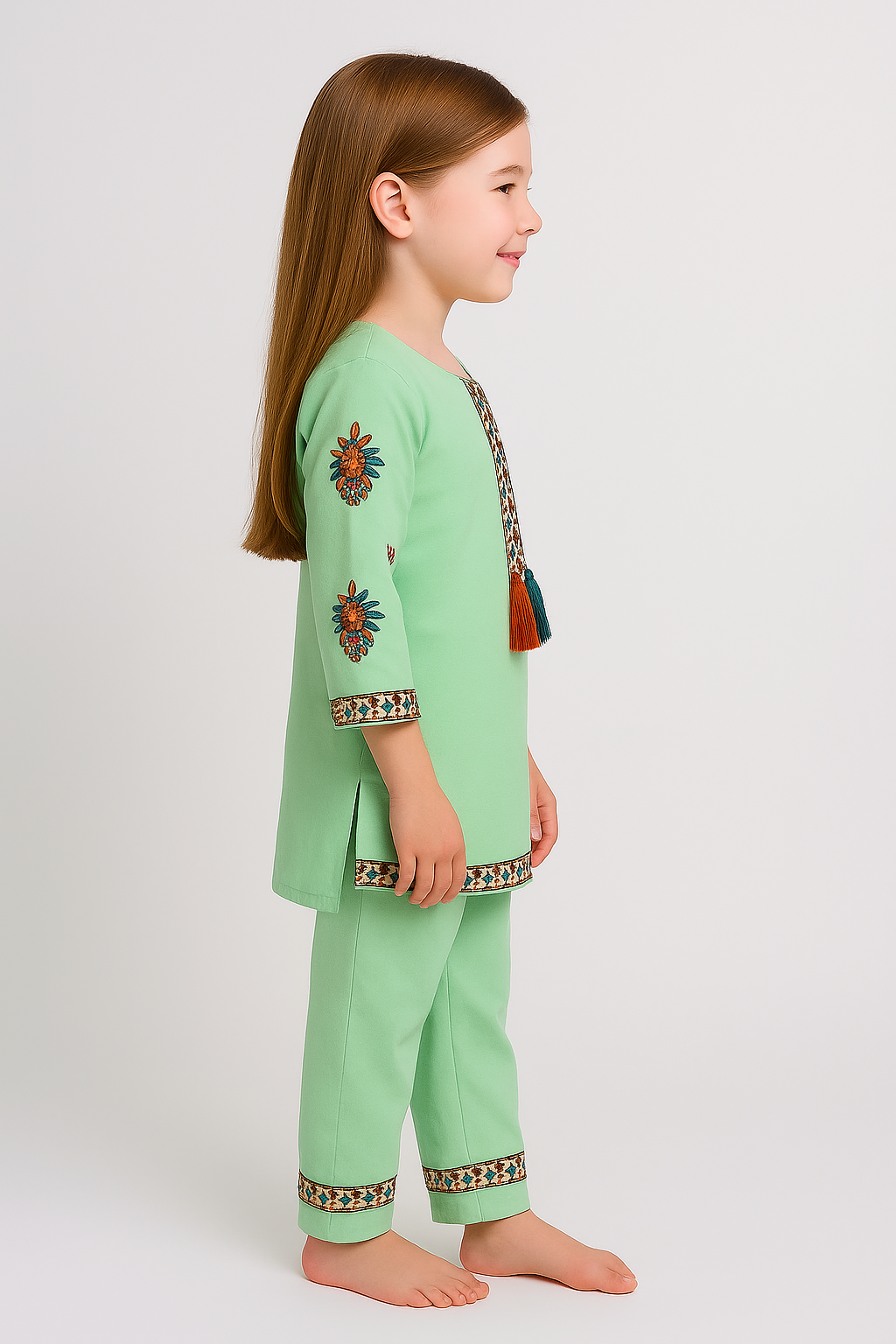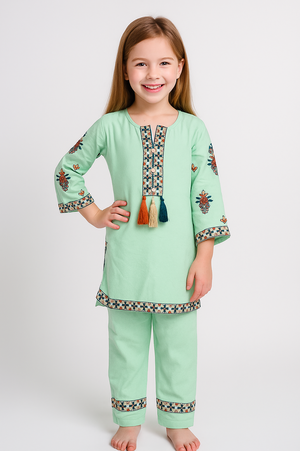 Mint Green Embroidered Kurta Set for Girls (5–10 Years)