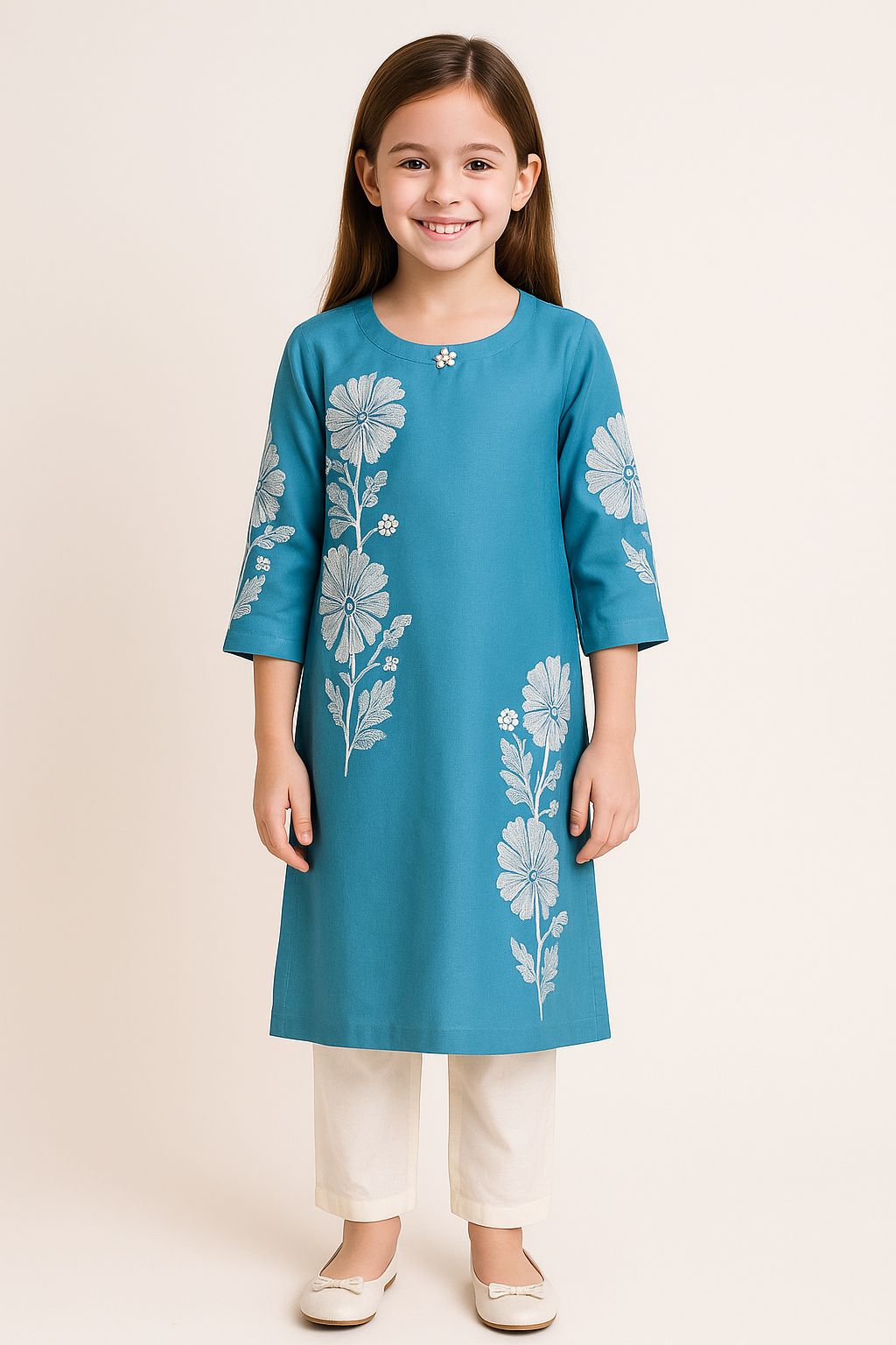 Add a pop of color to your little one’s ethnic wardrobe with this teal blue cotton kurti set for girls, featuring bold floral embroidery that brings charm and freshness to traditional style. Designed for comfort and elegance, this kurti comes with classic ivory pants – perfect for festive days, family gatherings, or cultural celebrations.