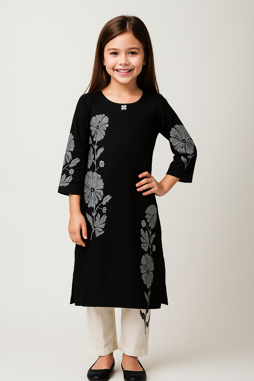Add a pop of color to your little one’s ethnic wardrobe with this Black cotton kurti set for girls, featuring bold floral embroidery that brings charm and freshness to traditional style. Designed for comfort and elegance, this kurti comes with classic ivory pants – perfect for festive days, family gatherings, or cultural celebrations.