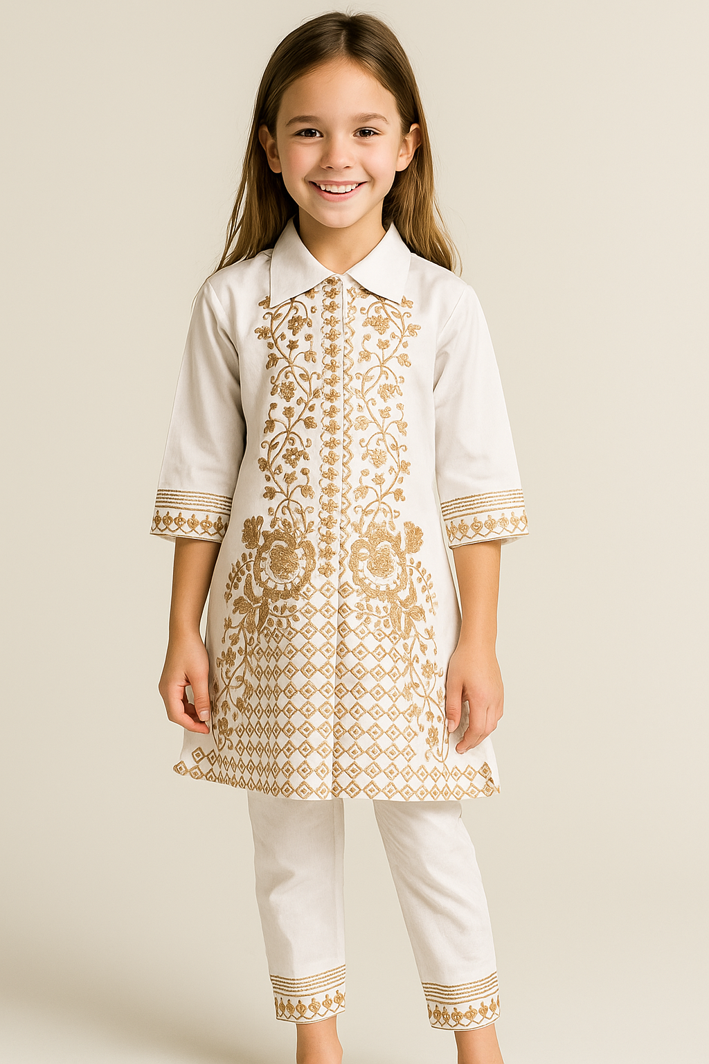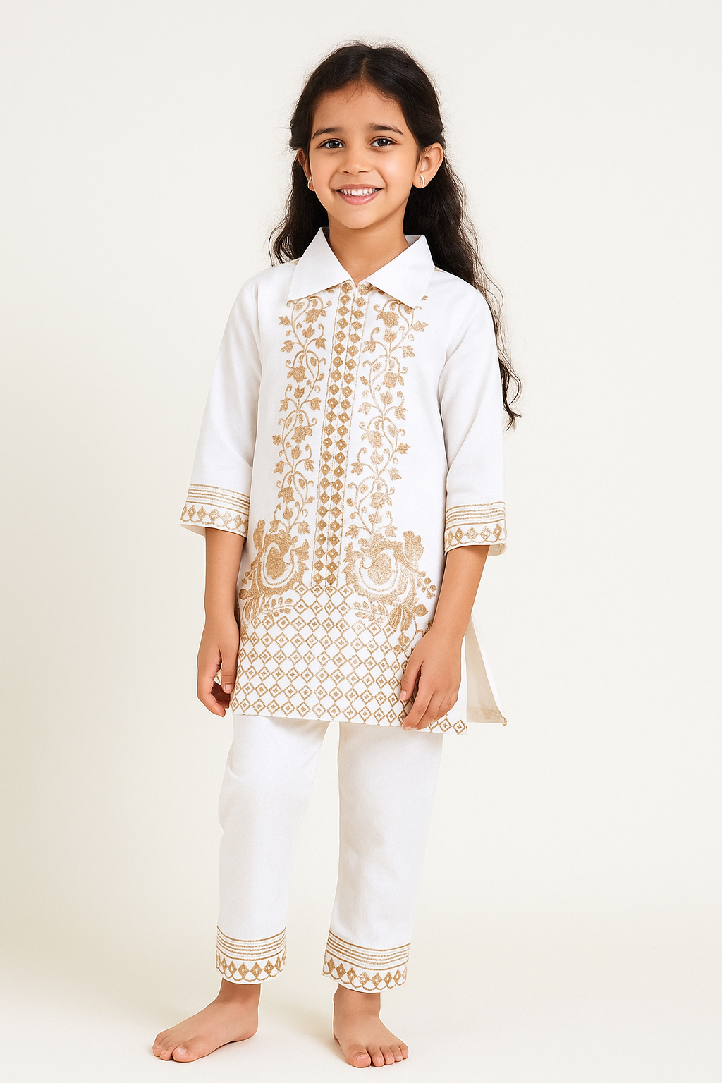 Elegant White & Gold Embroidered Kurti Set for Girls (3–10 Years)
