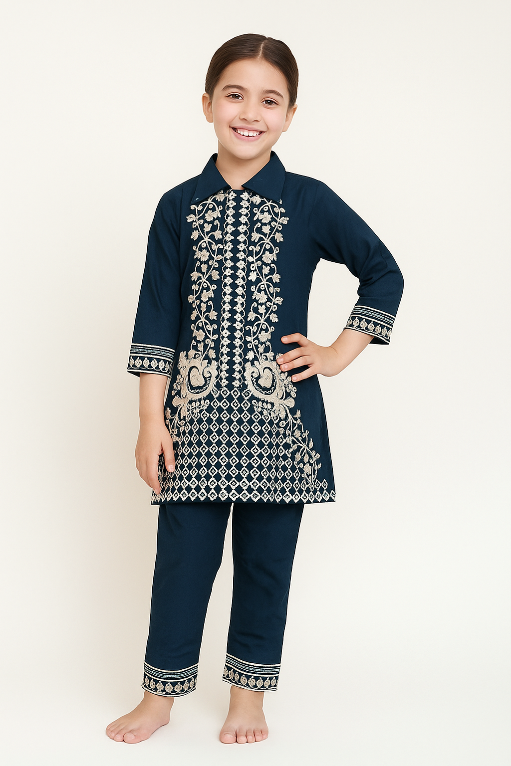 Let your little one shine in timeless elegance with our beautifully crafted Rama Green kurti set, adorned with intricate Cream embroidery. Designed for girls aged 3 to 10 years, this set features a collared straight-cut kurti with floral and geometric detailing paired with matching straight-fit pants. The breathable cotton fabric ensures comfort all day long, making it perfect for festive occasions, weddings, or special family gatherings.