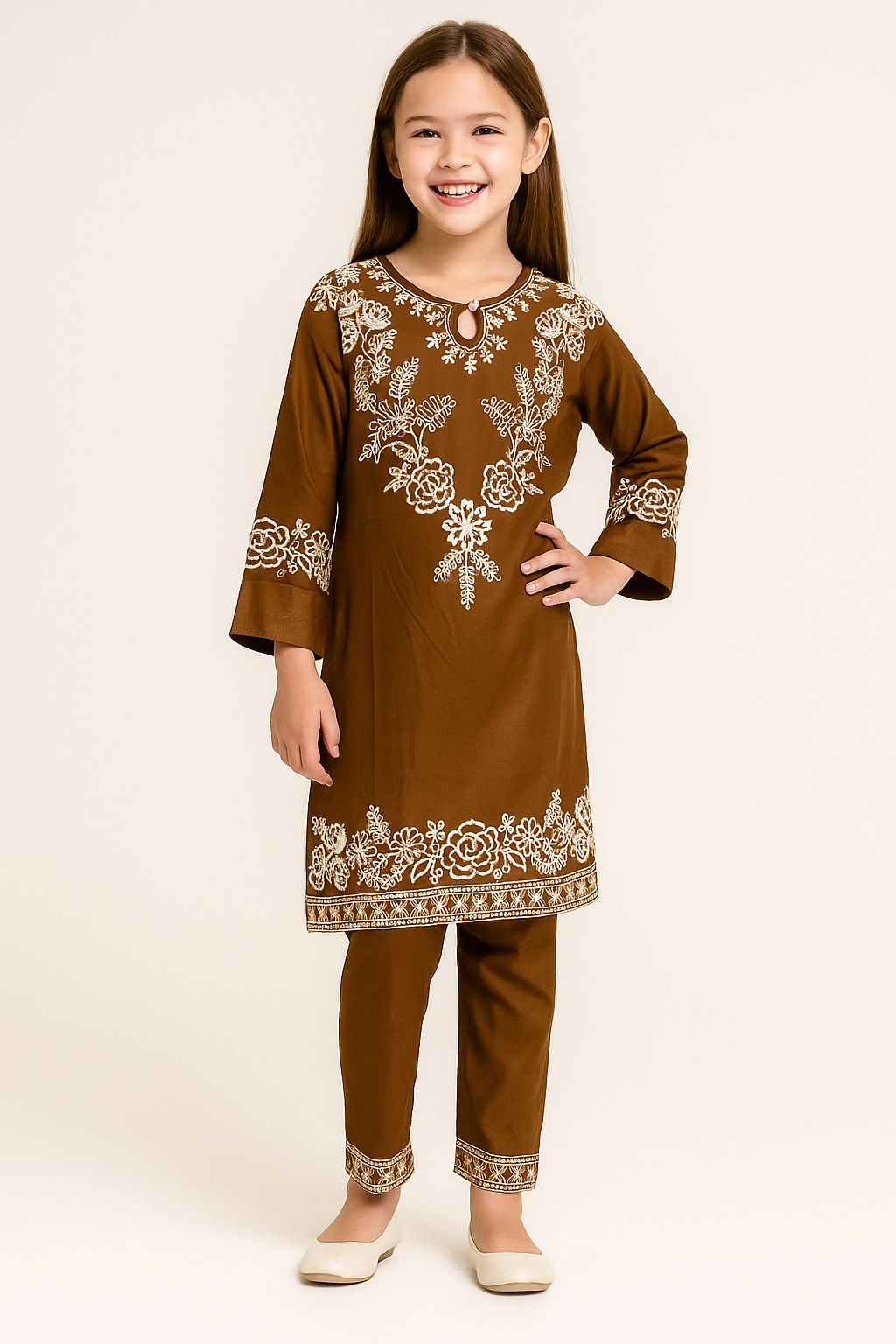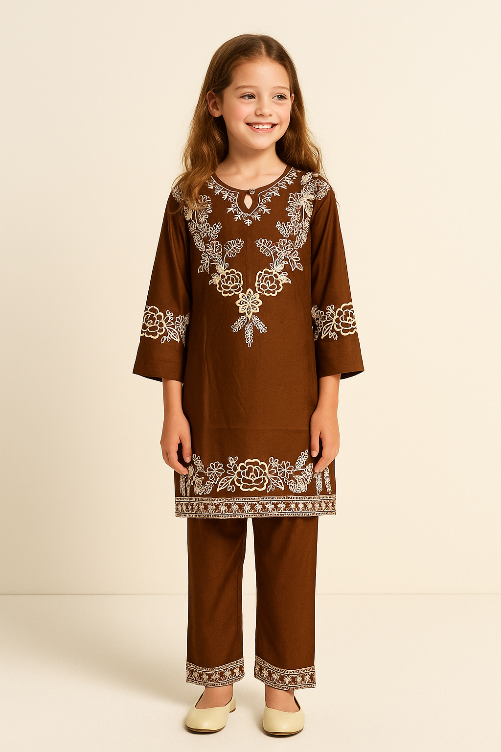 Add a touch of elegance to your little one’s wardrobe with this Brown kurti set adorned with Cream embroidery. Crafted from soft and breathable fabric, this outfit ensures all-day comfort while keeping your child stylish and graceful. The kurti features delicate threadwork on the neckline, sleeves, and hemline, paired with matching straight pants for a complete ethnic look.