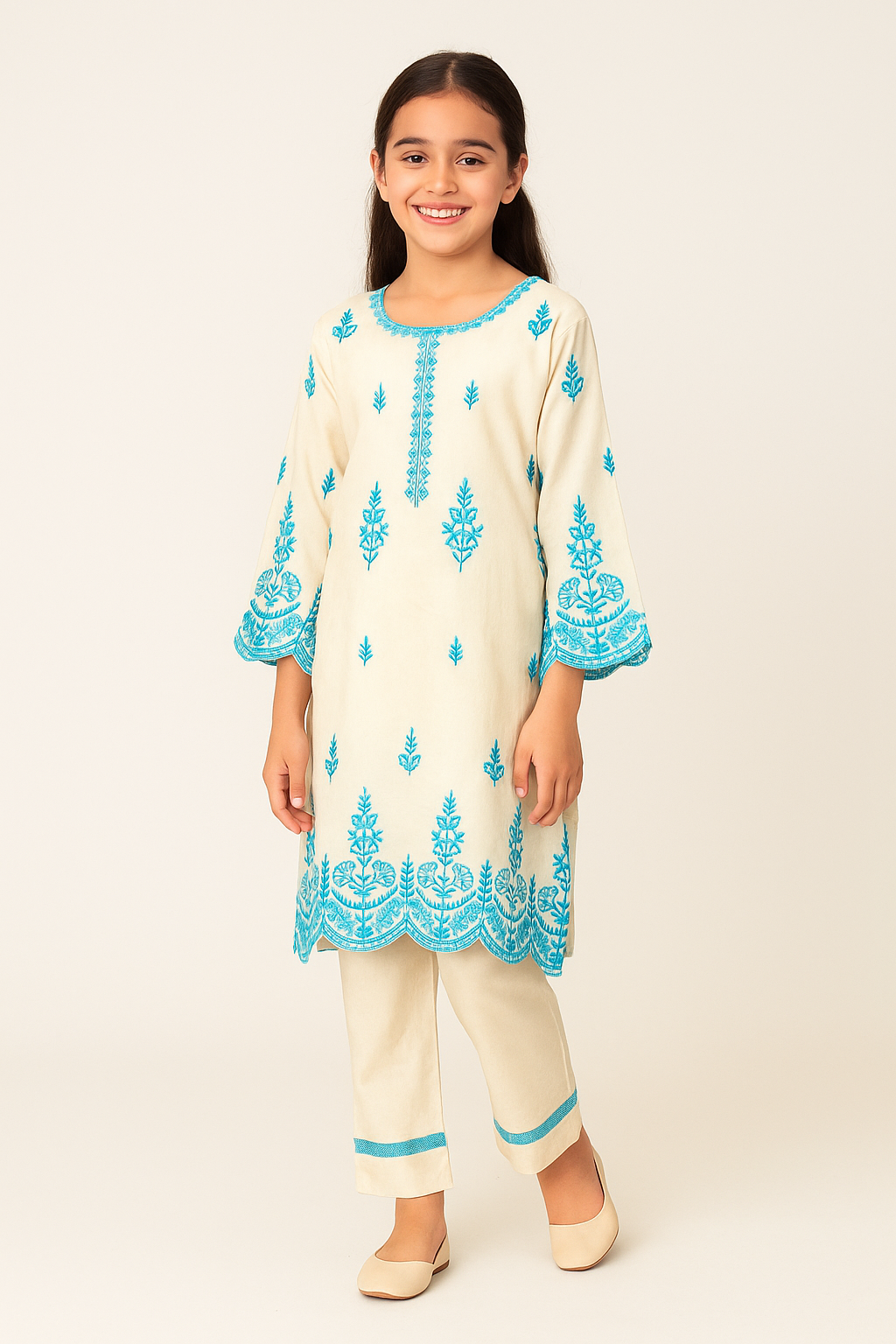 Add a touch of tradition with style to your little one’s wardrobe with this ivory cotton kurti set for girls from House of Iqf. Beautifully designed with bright blue thread embroidery on the neckline, sleeves, and hem, this outfit blends cultural elegance with modern comfort. The scalloped hemline and detailed floral motifs make it a standout choice for festive and casual wear.