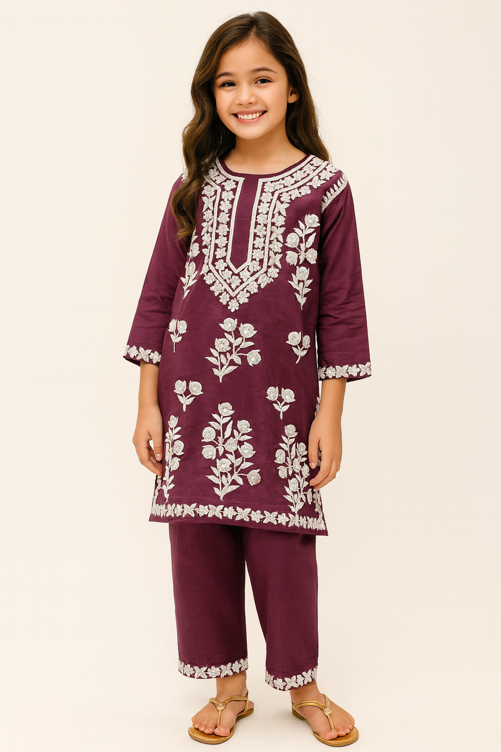 Bring timeless grace to your little one’s wardrobe with this Purple Embroidered Kurti Set from House of IQF. Designed with intricate white floral embroidery on a rich brown base, this outfit perfectly blends traditional charm with modern simplicity.