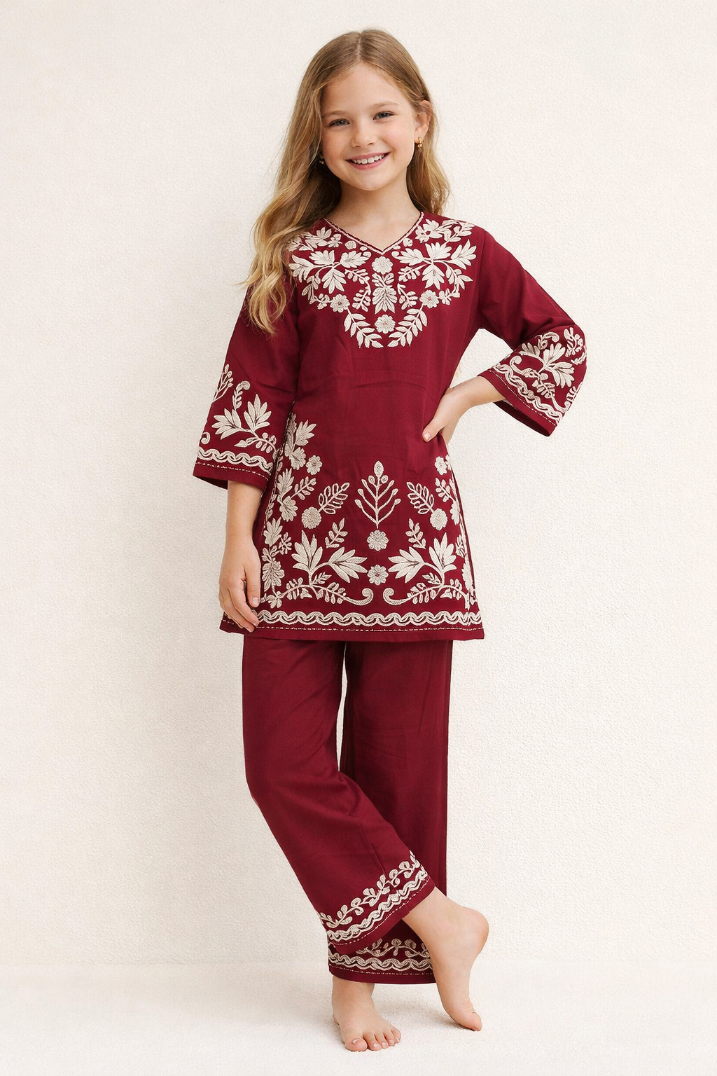 Elevate your little girl’s festive and casual wardrobe with this girls Red embroidered kurti co-ord set, designed to bring together comfort, tradition, and modern elegance. Made from soft, breathable premium fabric, this outfit ensures all-day ease while looking effortlessly stylish.
