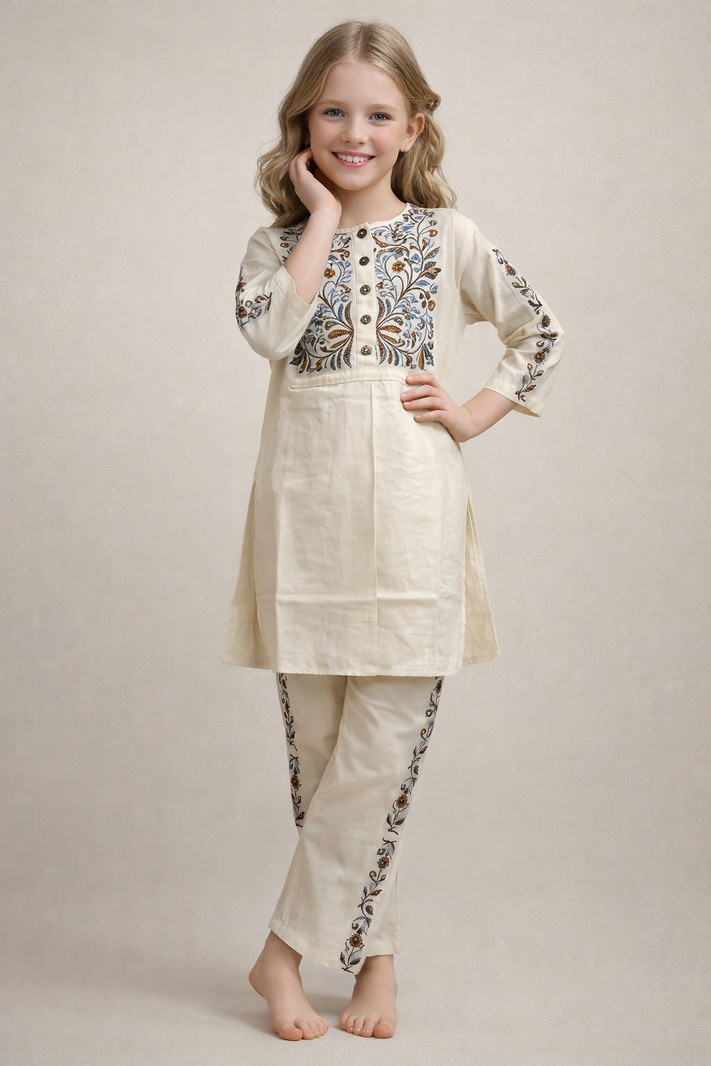 Introduce timeless elegance to your little girl’s wardrobe with this girls ivory embroidered kurti pant set, thoughtfully crafted for comfort and sophistication. Made from premium breathable cotton-blend fabric, this outfit ensures a soft, lightweight feel—perfect for long festive days and special occasions.