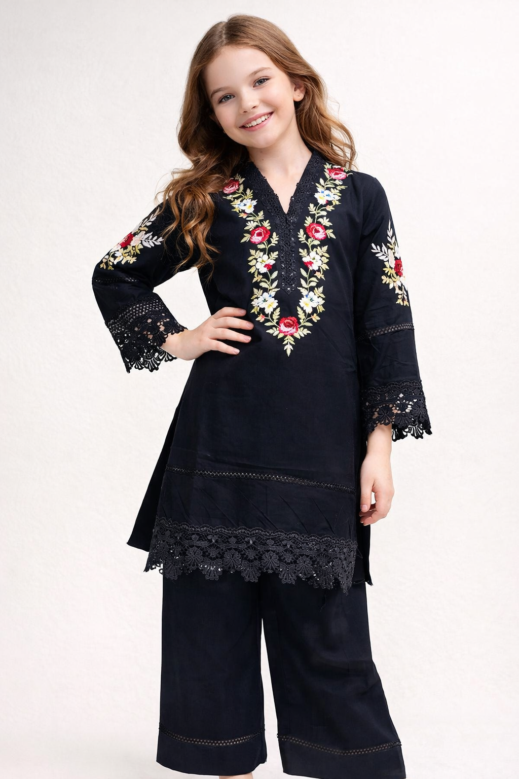 Girls Black Floral Embroidered Kurta Palazzo Set – Elegant Festive Wear for Kids 🌹🖤