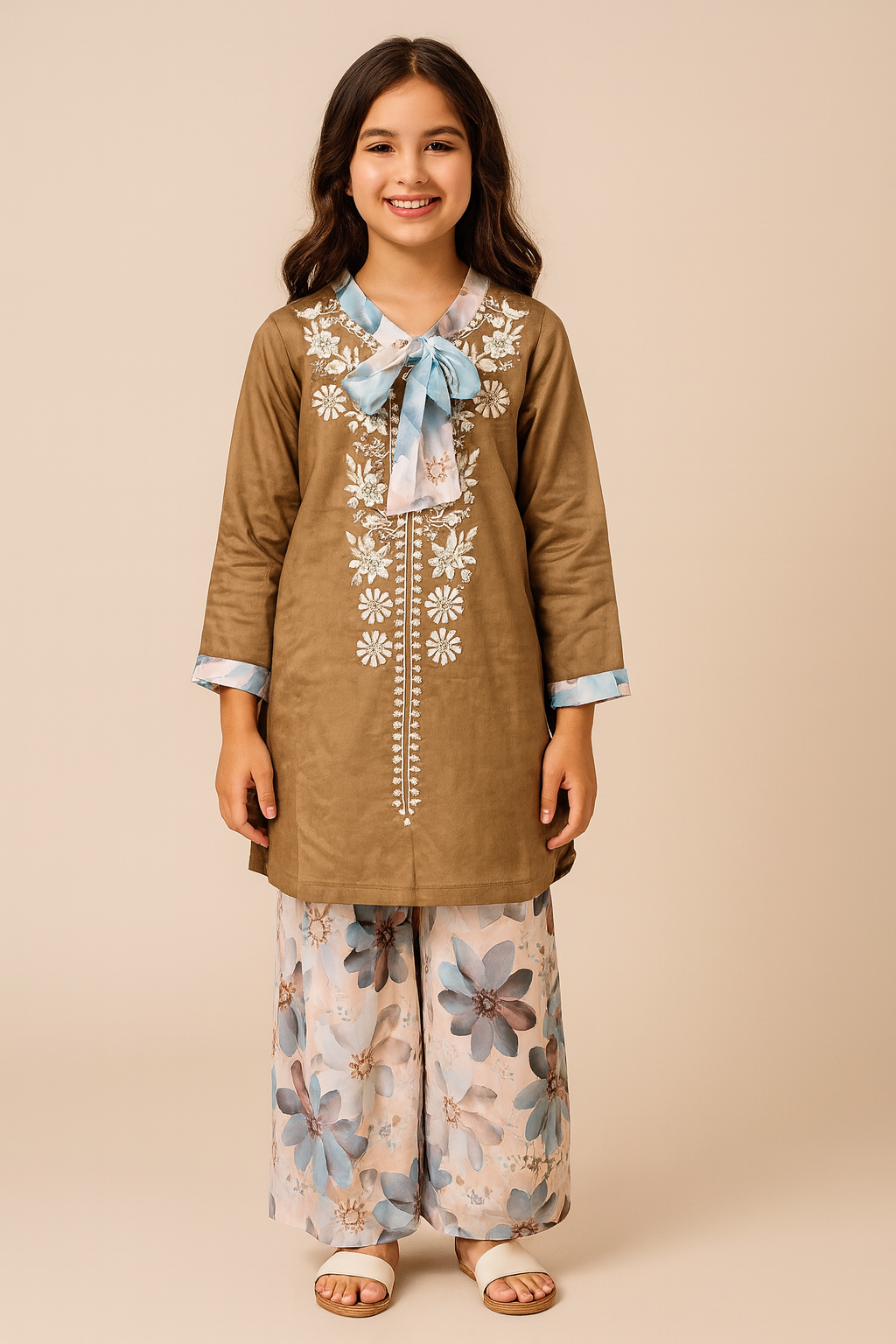 Add a splash of freshness to your little one’s festive wardrobe with this Brown Embroidered Kurti with Printed Plazo Set from House of IQF. The elegant white kurti features delicate aqua embroidery and a matching bow tie neckline, giving it a charming and graceful appeal.