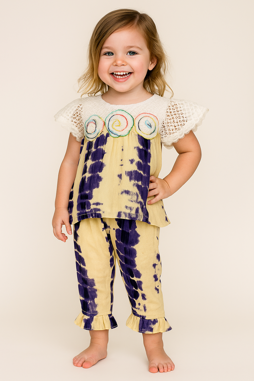 Let your little one express her playful side with this vibrant Yellow & Navy Tie-Dye Co-ord Set for girls aged 1 to 4 years. The top features colorful spiral accents across the chest and soft crochet lace flutter sleeves that add a touch of vintage charm. The relaxed fit and airy cotton fabric make it ideal for all-day wear.
