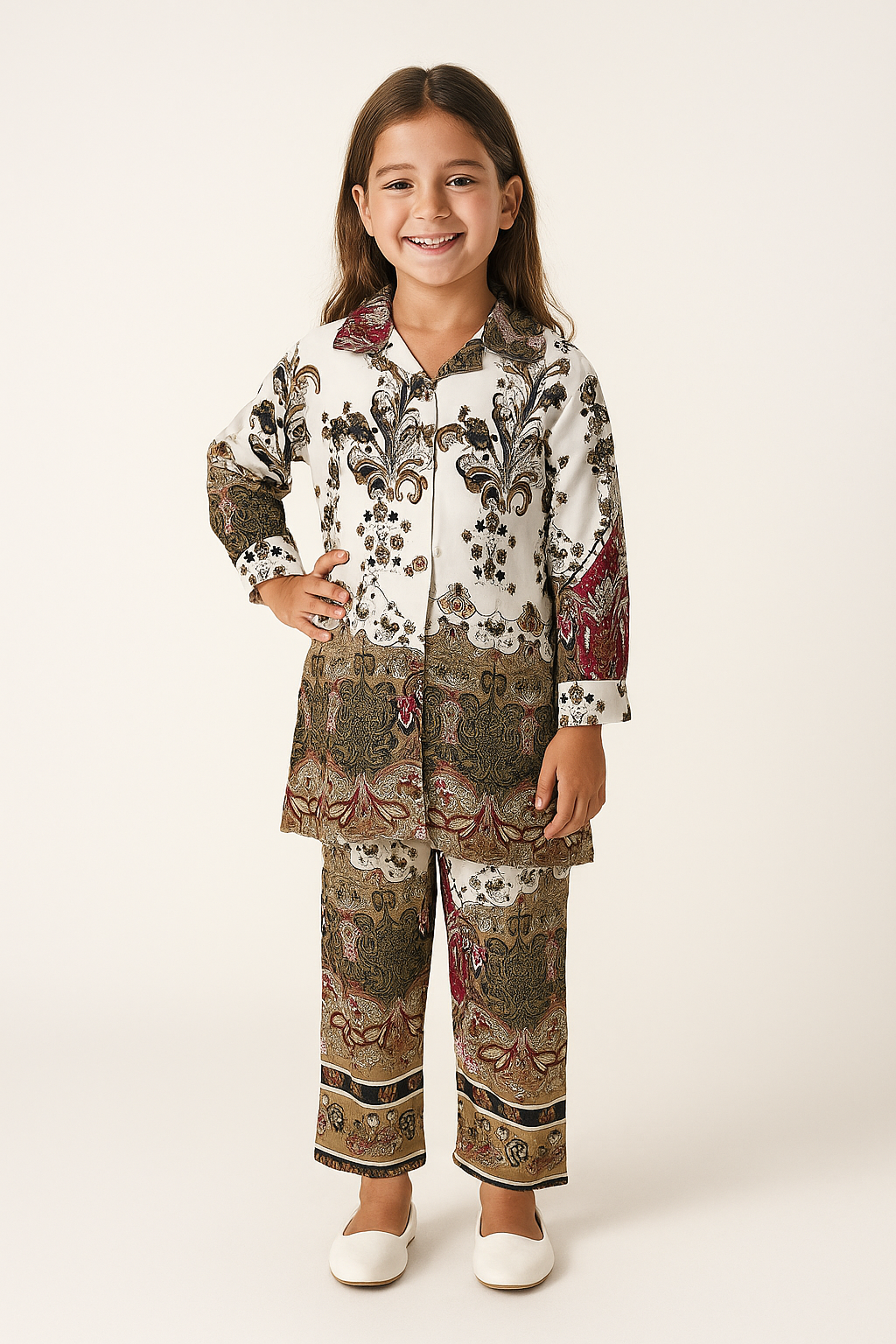 Add a splash of elegance and color to your girl's wardrobe with this multicolor printed kurti and pant set for girls, perfect for daily wear or festive flair. Made from premium quality cotton blend fabric, this set features an artistic mix of floral and paisley prints in earthy tones — creating a rich and stylish ethnic look.