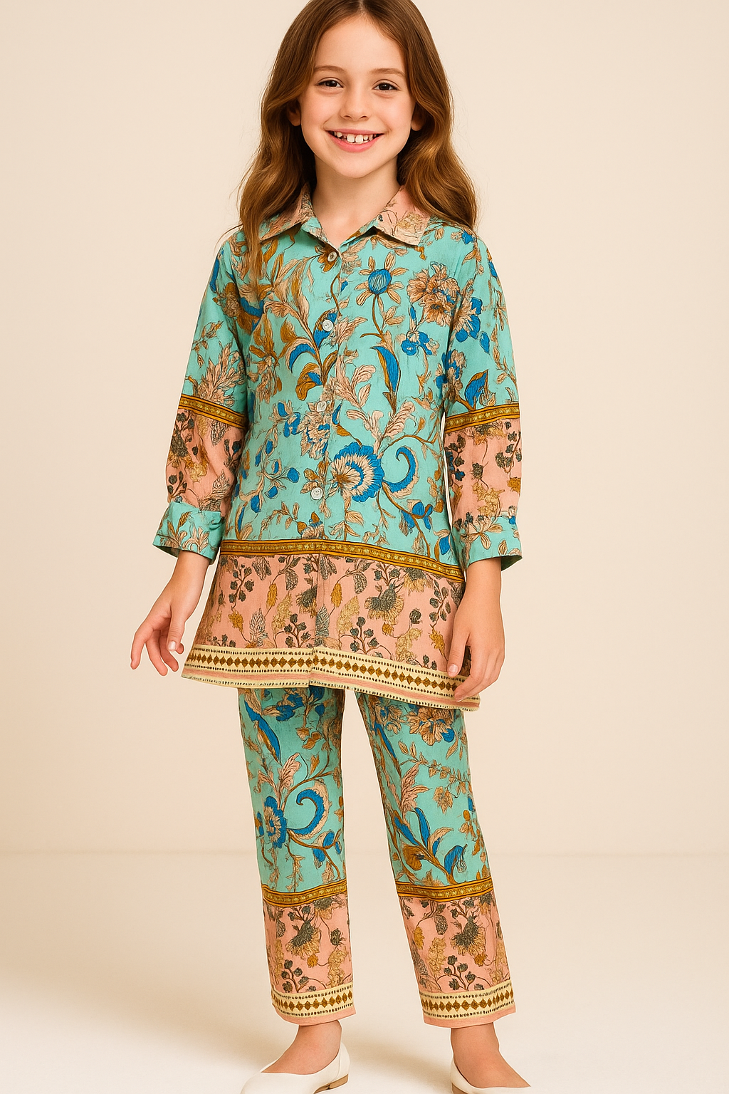 Give your little one a classy makeover with our Girls’ Designer Printed Kurti & Pant Set, crafted for elegance and comfort. This two-piece outfit features a collared kurti with intricate baroque-inspired prints in rich tones of gold, brown, and navy, paired with matching straight-fit pants for a complete ethnic look.