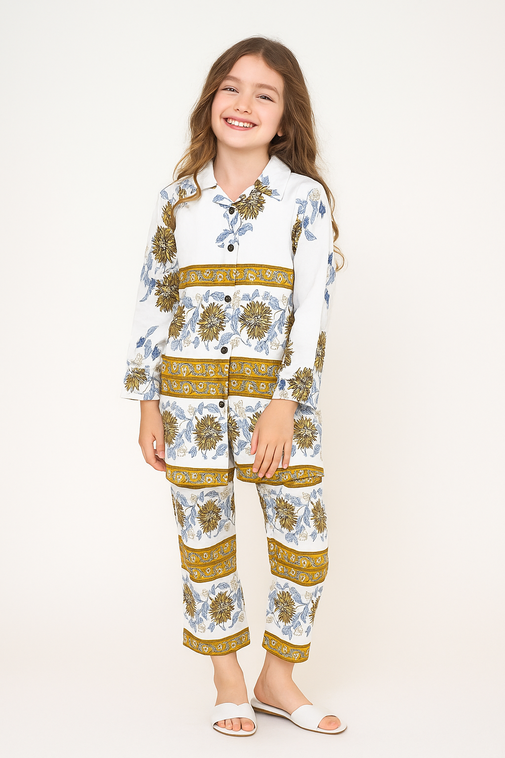 Add a touch of freshness to your little one’s wardrobe with this white & mustard floral printed kurti set, crafted for elegance and comfort. The kurti features bold sunflower-inspired prints with mustard and blue detailing, paired with matching straight-fit pants for a coordinated look. The button-down front with collared neckline gives it a modern, stylish finish.
