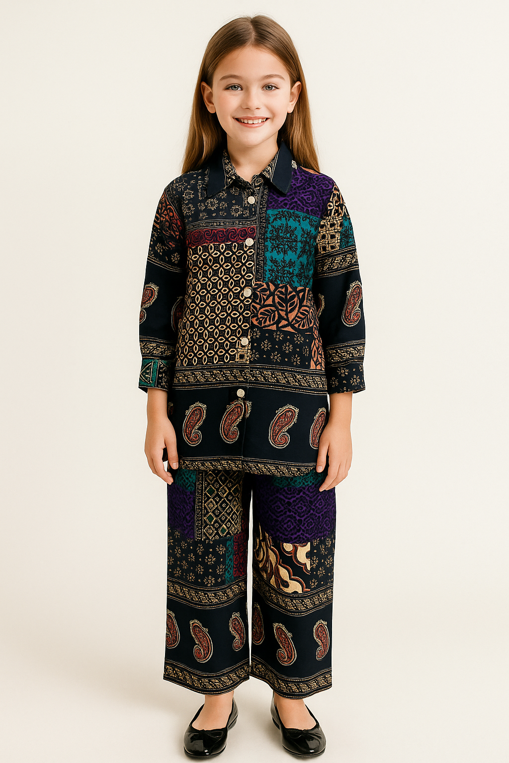 Add a splash of color and culture to your little one’s wardrobe with this bohemian patchwork co-ord set, designed for girls who love to stand out in style. The vibrant mix of earthy tones, paisley motifs, and geometric patterns gives this outfit a unique ethnic-fusion charm.