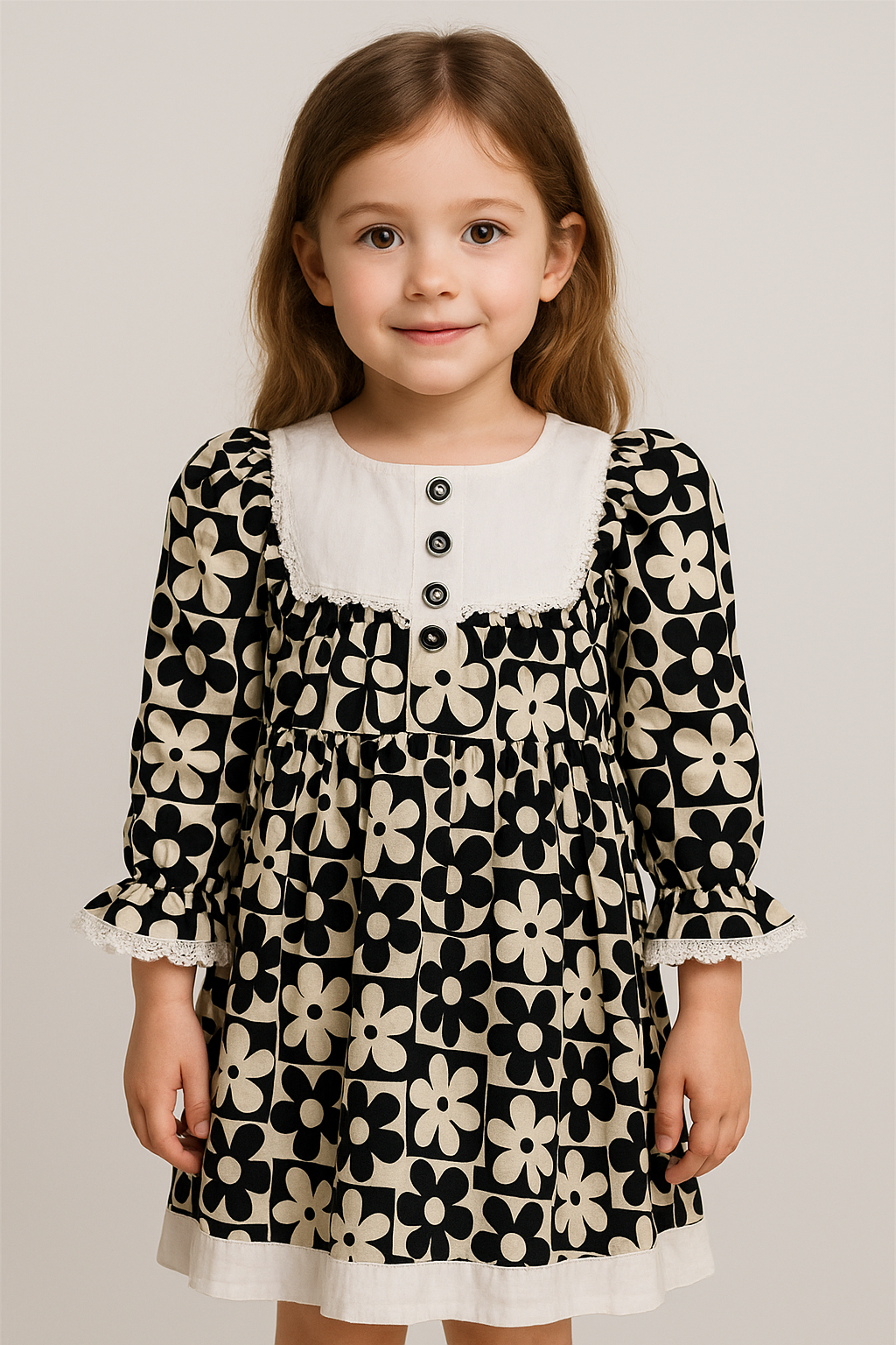 Bring charm and comfort to your little one's wardrobe with our Black Floral Ruffle Cotton Dress. Made from soft, breathable cotton, this adorable dress features an all-over cream Colour floral print on a lively black base. The playful ruffle detailing on the front and sleeves adds a touch of elegance, while the button-down design ensures ease and style. Perfect for casual outings, birthdays, or festive occasions, this dress is both cute and comfortable.