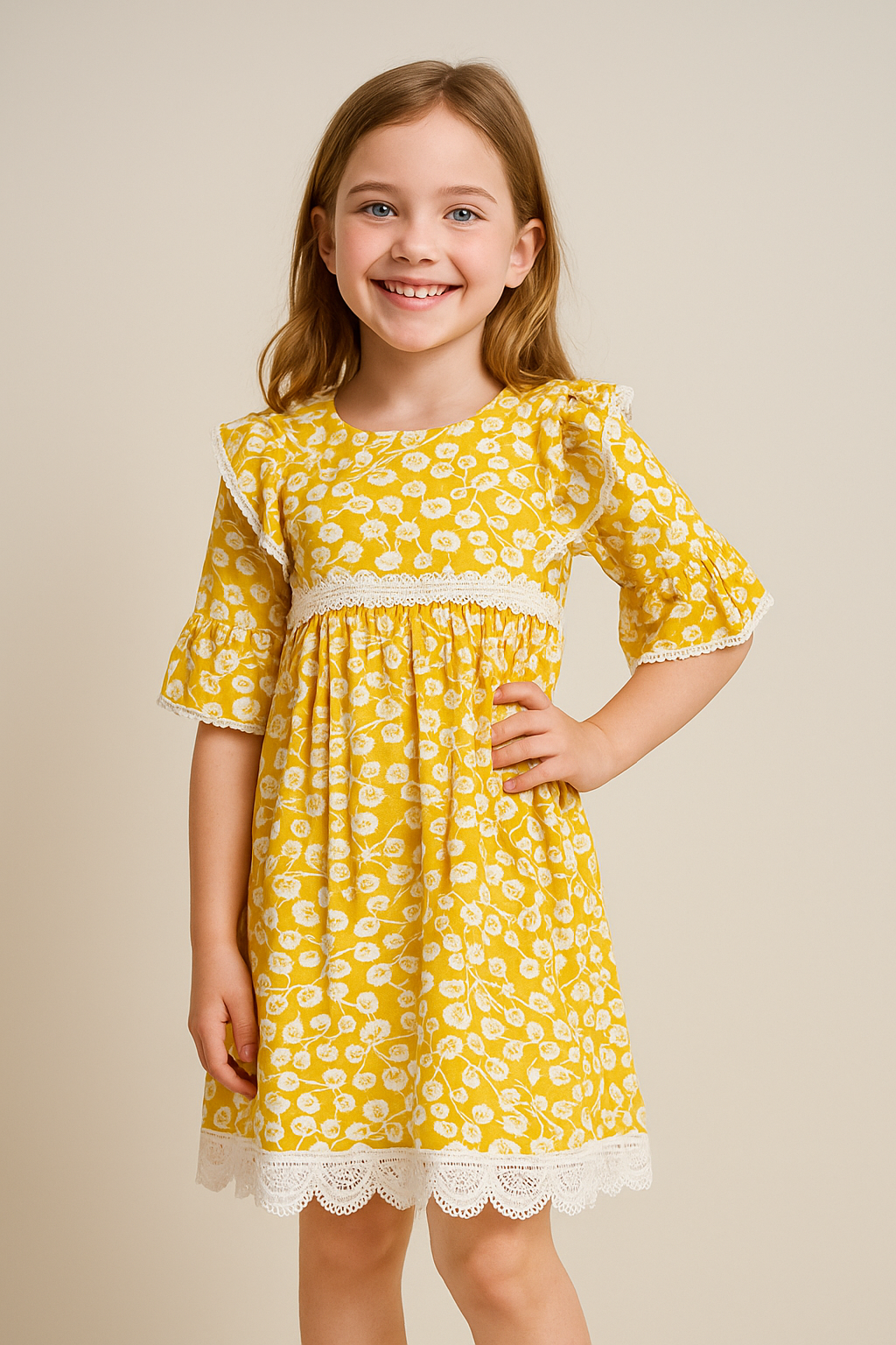 Sunny Yellow Floral Frock with Lace Trim – For Girls Aged 3 to 10 Years