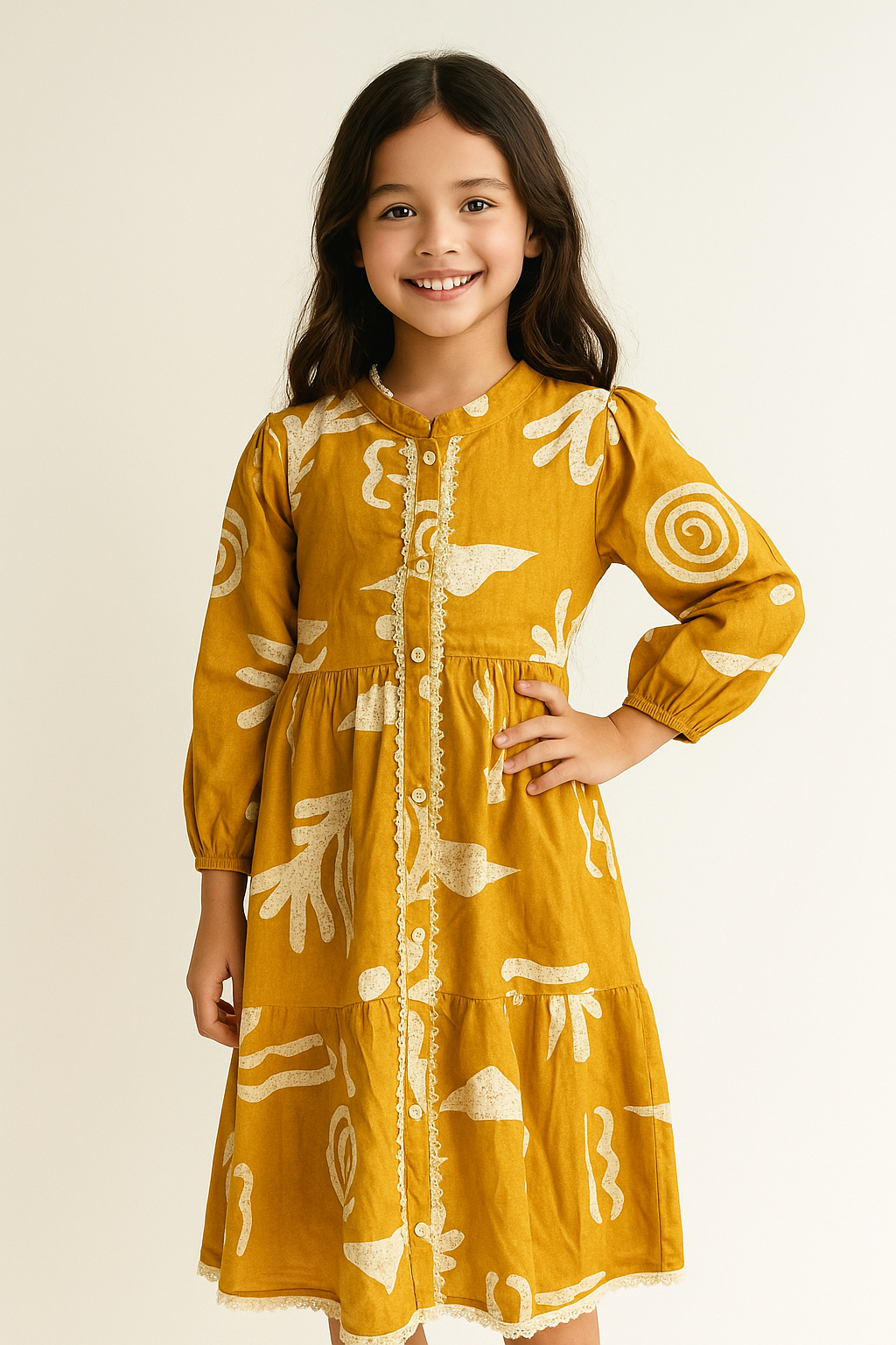 Brighten up your little one’s wardrobe with this mustard yellow printed dress for girls from House of Iqf. Featuring playful abstract white prints all over, this stylish dress comes with a front button-down design and delicate lace detailing along the placket and hemline. The gathered waist and flared silhouette add a charming twirl effect, making it both trendy and comfortable.