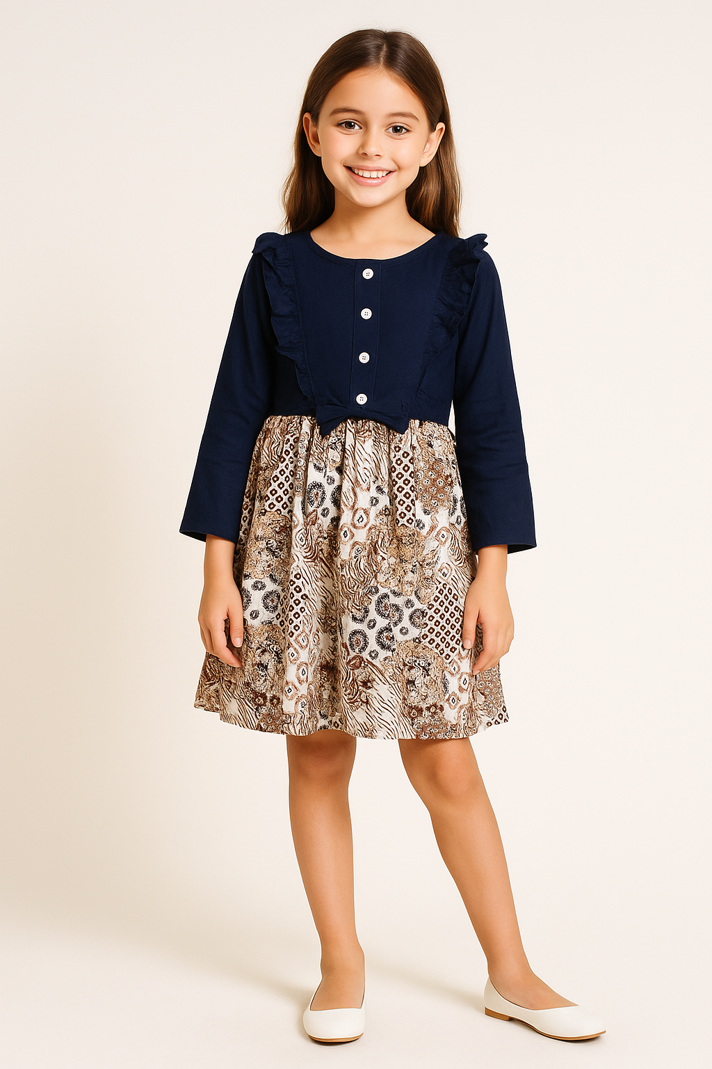 Give your little one a fashionable upgrade with our Girls’ Navy Blue & Printed Dress, designed to combine comfort with chic style. The dress features a solid navy blue bodice with ruffle details, front button closure, and a cute bow at the waist, paired with a flared printed skirt in earthy tones for a striking contrast.