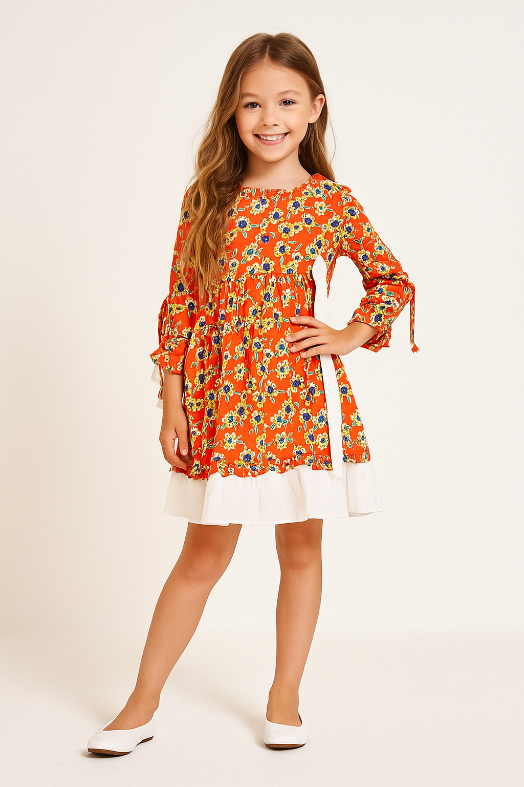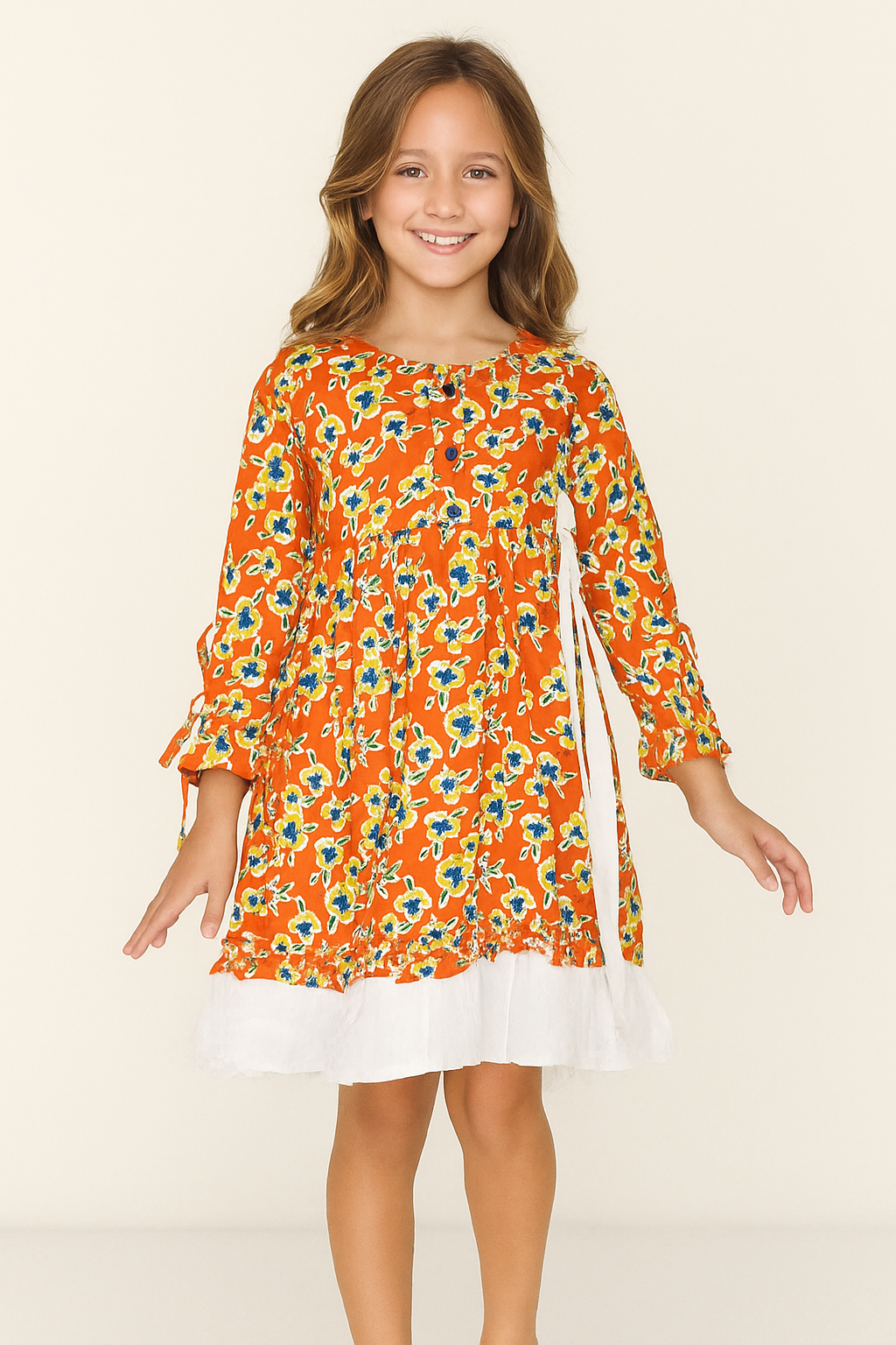 Add a burst of color to your child’s wardrobe with this orange floral frock for girls, crafted in premium breathable cotton for everyday comfort and festive charm. The dress features a vibrant all-over floral print in blue and yellow, complemented by tie-up sleeves and a flared silhouette. The contrasting white hemline adds an extra touch of elegance, making it a perfect pick for both casual and party wear.