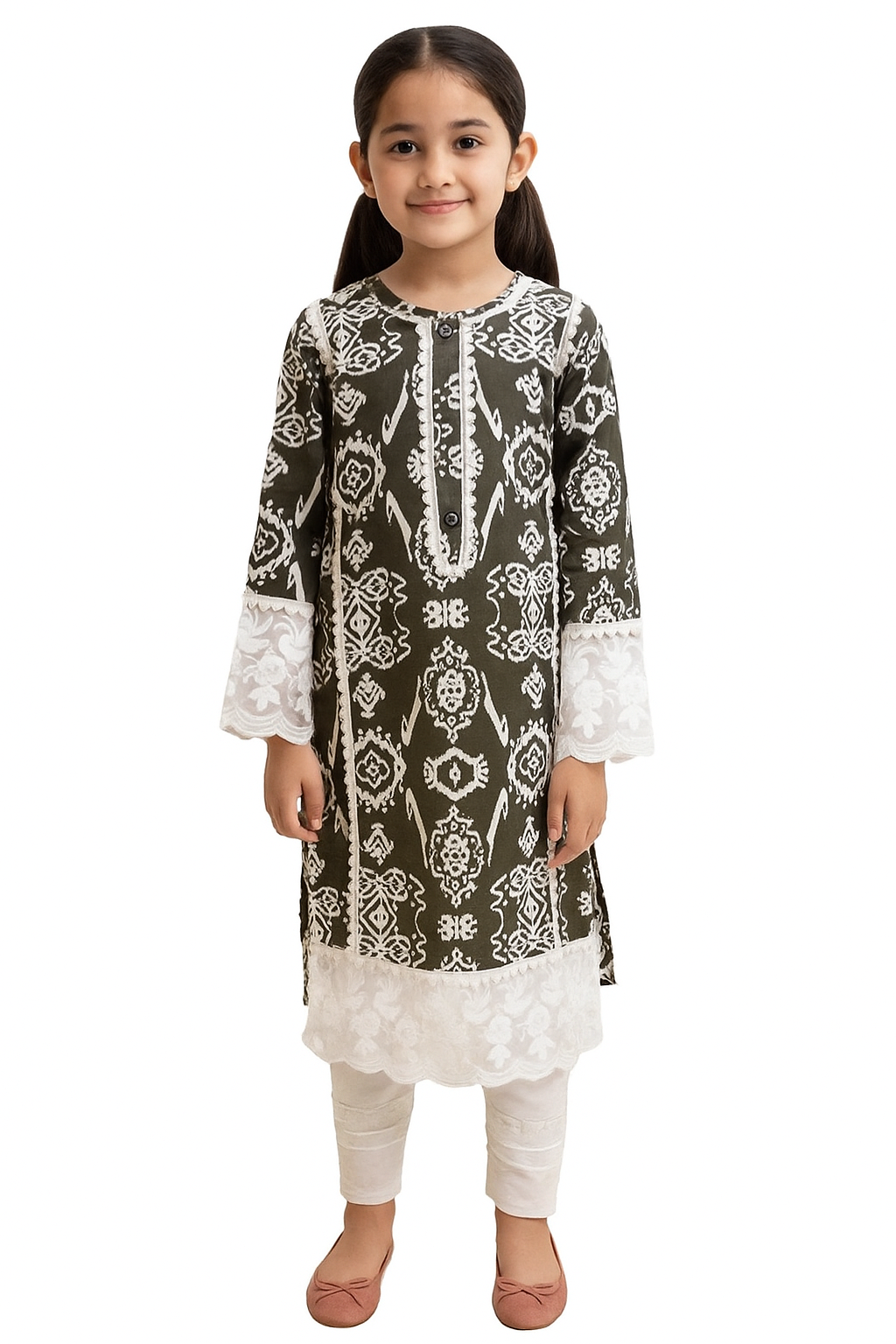 Give your girl's ethnic wardrobe a bold and classy twist with this bottle green and white printed kurti set for girls, featuring intricate patterns and elegant net embroidery details. Made from soft, breathable fabric, this outfit combines comfort with eye-catching design — ideal for festive days, outings, or family events.