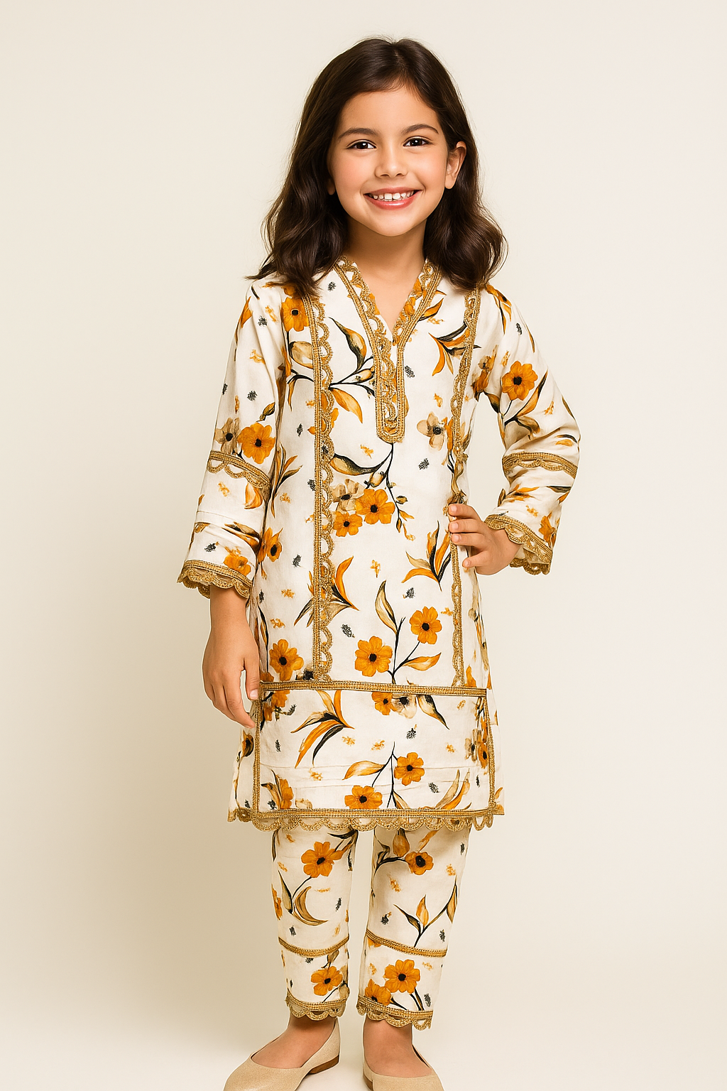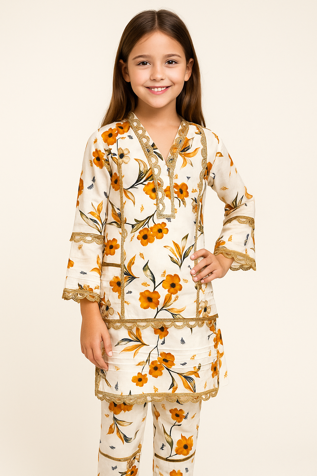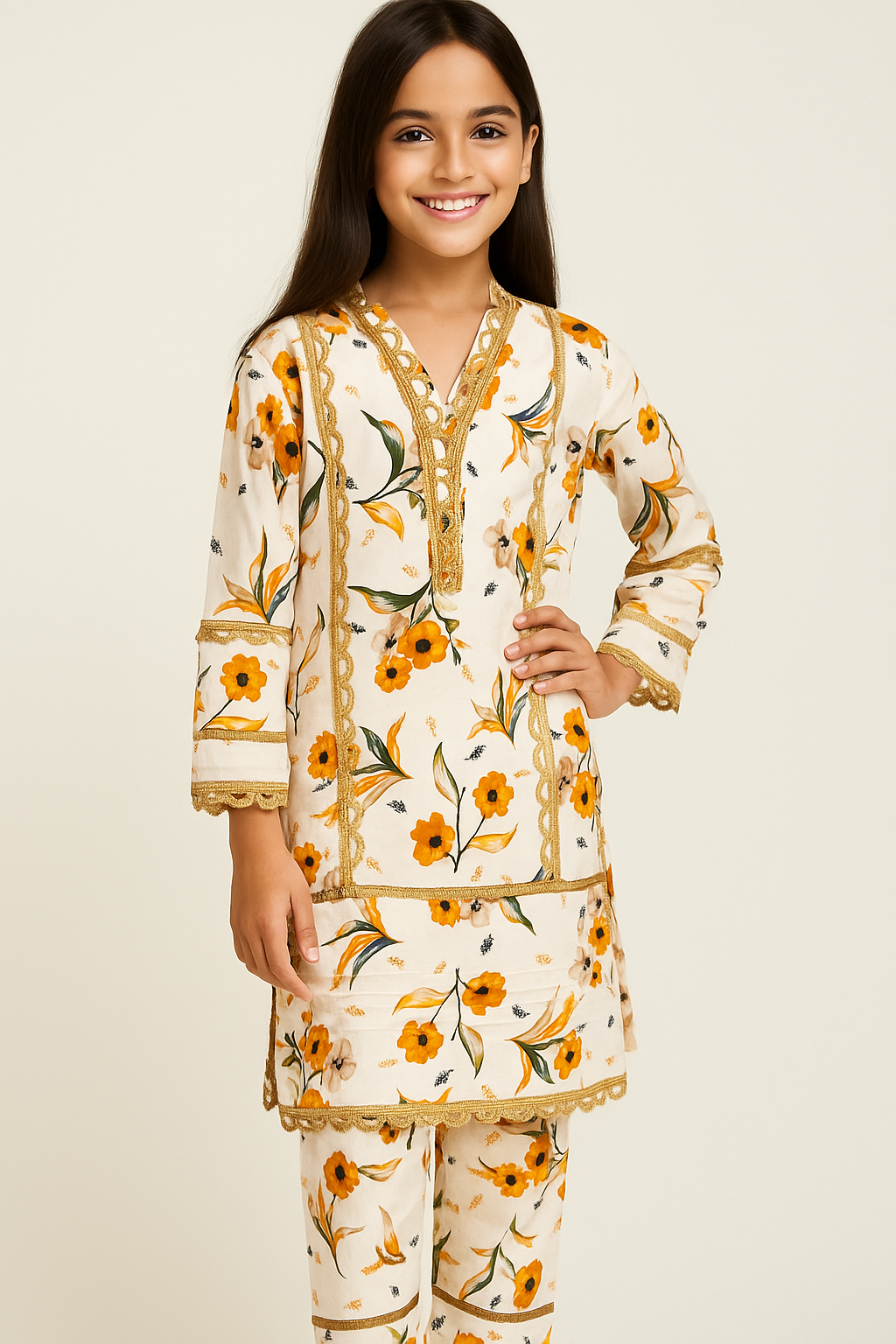 Bring timeless elegance to your little girl’s wardrobe with our Girls Floral Kurti Set, designed for comfort and style. Featuring a soft cream base adorned with vibrant yellow and orange floral prints, this outfit is enhanced with intricate golden lace detailing along the neckline, sleeves, hem, and front panel for a festive touch.