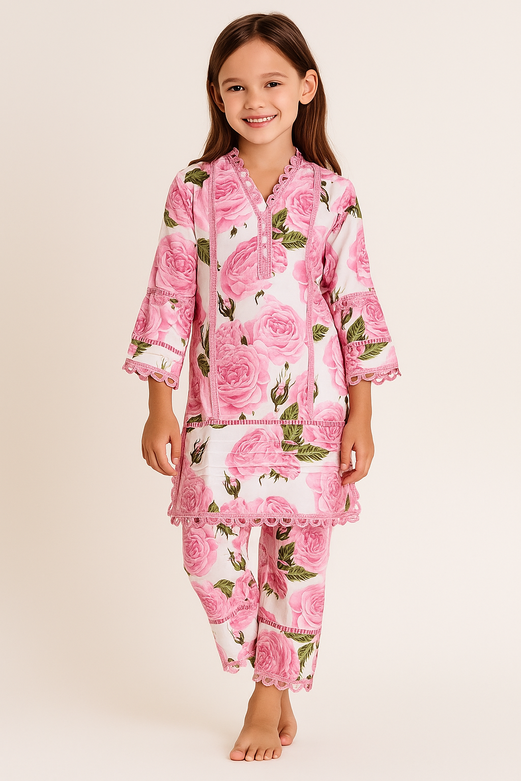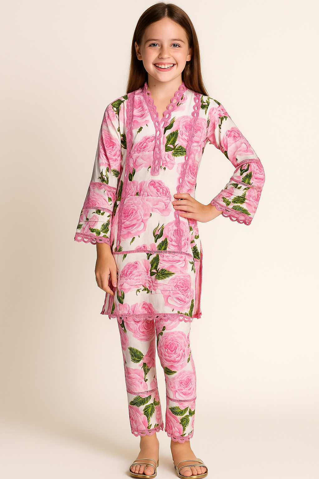 Girls Floral Kurti Set – Elegant Ethnic Wear with Golden Lace Detailing