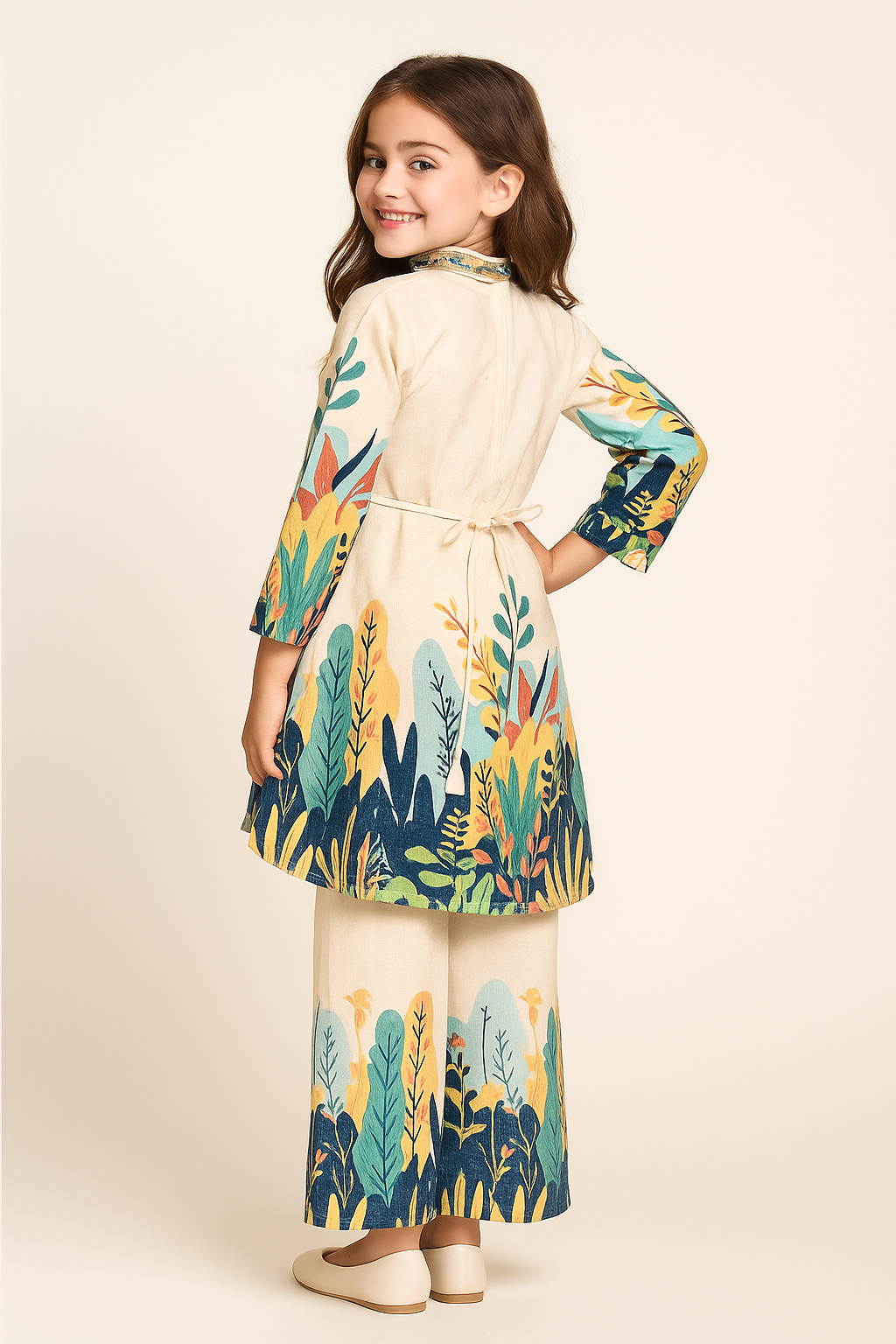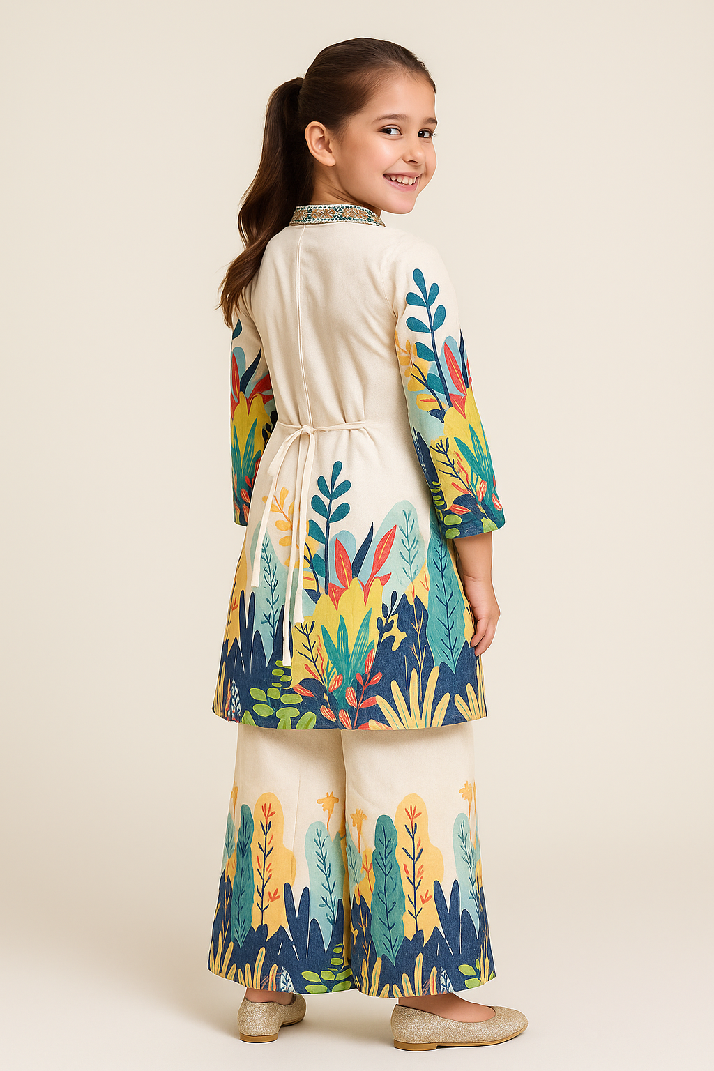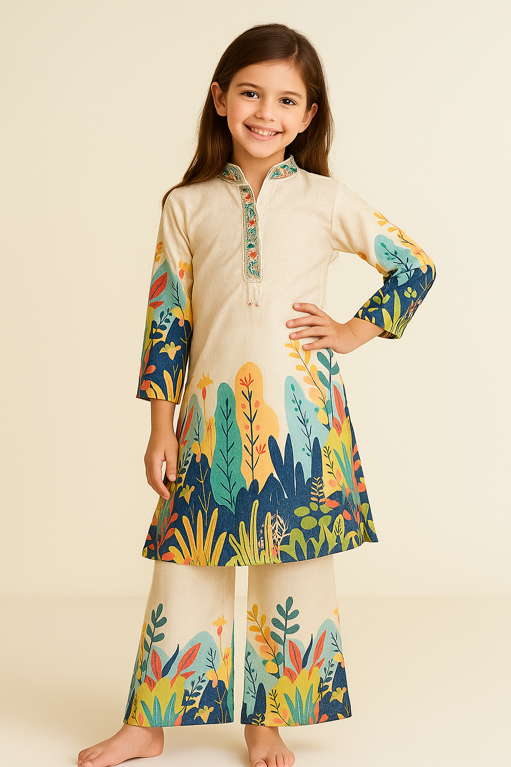Bring a pop of color to your little one’s wardrobe with this stylish Cream kurta and palazzo set for girls. Designed in a soft, breathable fabric, this outfit features a soothing cream base beautifully adorned with vibrant botanical and floral prints in shades of green, yellow, orange, and blue. The kurta is styled with a classic collar, delicate embroidery on the neckline, and long sleeves for a chic yet comfortable look. Paired with wide-leg palazzo pants that mirror the colorful print, this set is perfect for festive occasions, family gatherings, and casual outings.