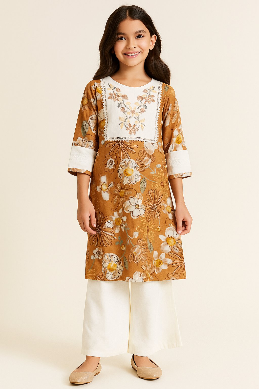 Bring effortless charm to your little one’s wardrobe with this girls’ printed kurta set. Designed in a soft mustard base with white floral prints, this kurta features a delicate embroidered yoke in contrasting white that adds a touch of elegance. The three-quarter sleeves with lace detailing and the straight-fit silhouette ensure comfort and style for all-day wear. Paired with classic white palazzo pants, this outfit is perfect for festive occasions, family gatherings, or casual outings.