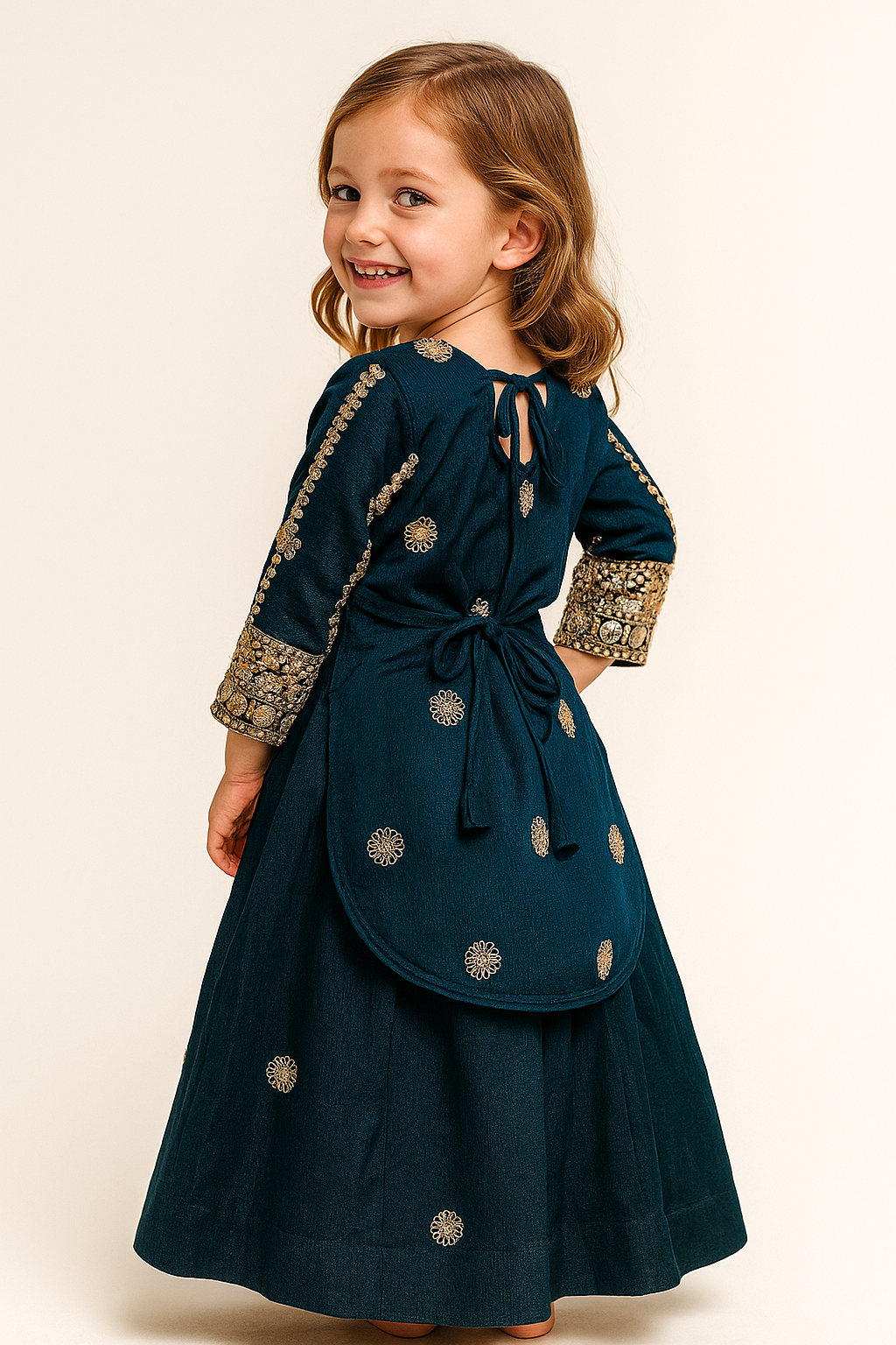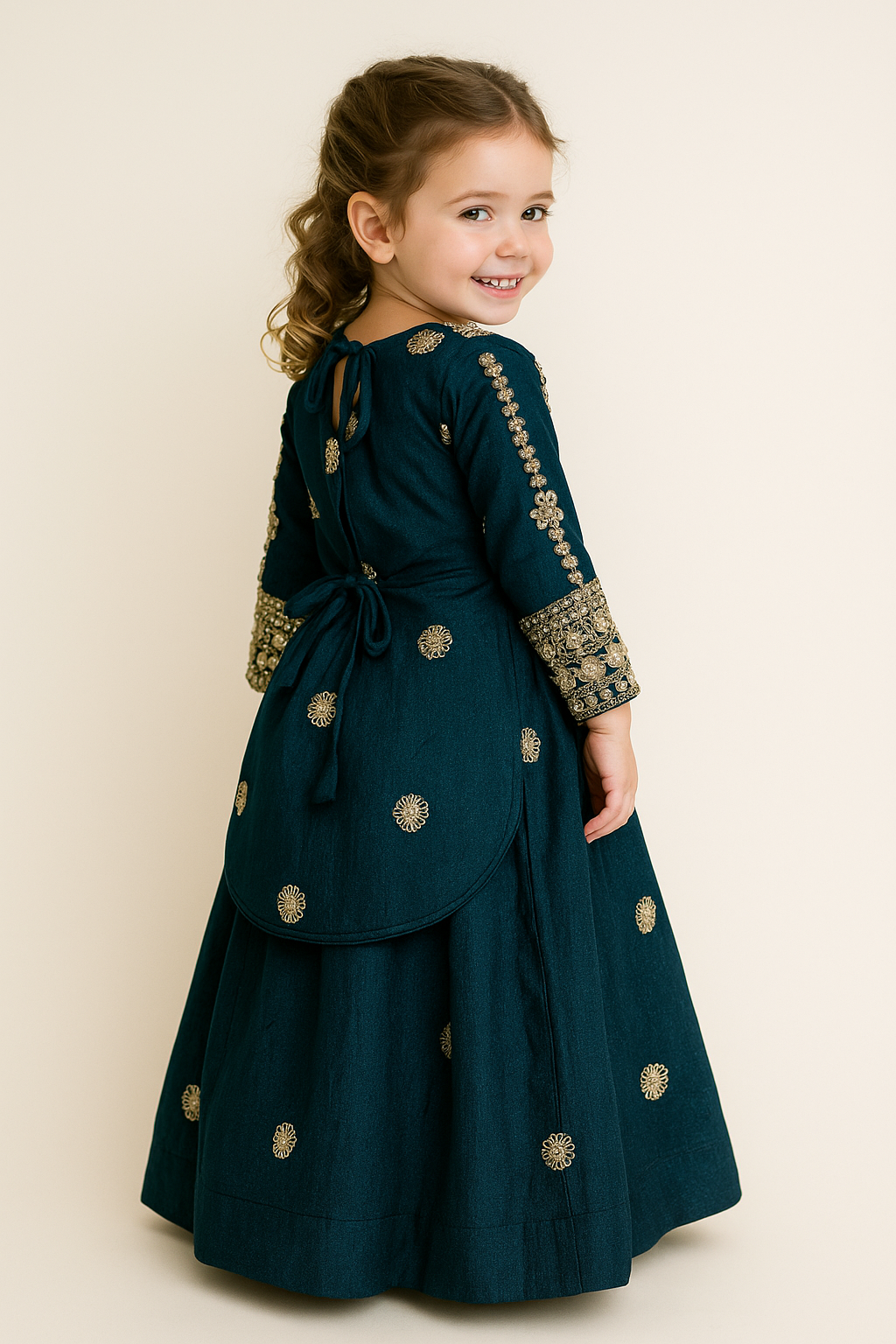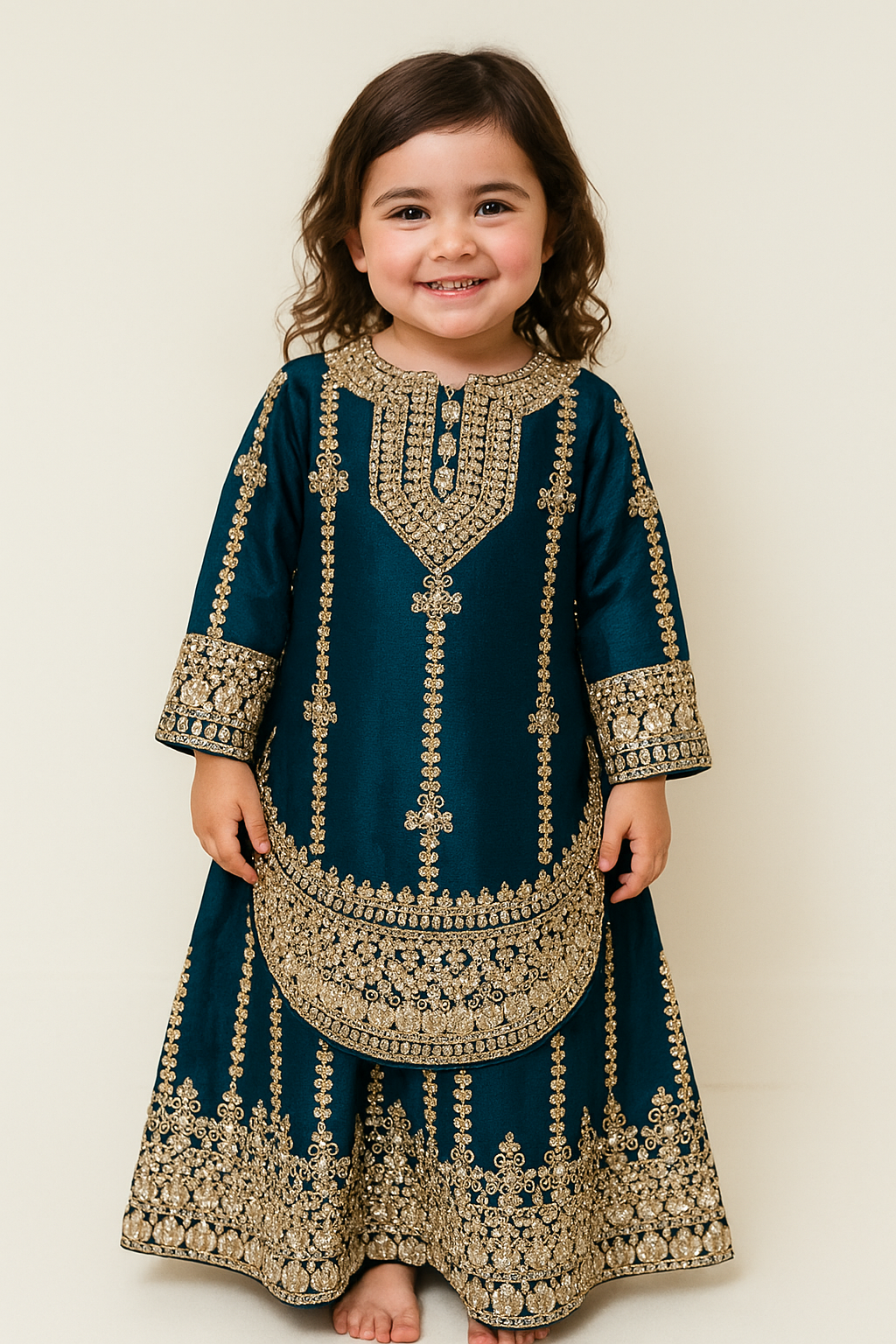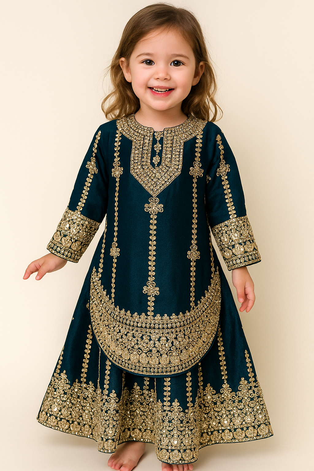 Add royal elegance to your little one’s wardrobe with this teal and gold embroidered Anarkali dress for girls, designed to make every festive occasion special. Crafted from premium silk-blend fabric, this outfit features intricate zari and sequin embroidery along the neckline, sleeves, hemline, and front panel, giving it a regal Mughal-inspired charm. The long-sleeve design ensures a graceful look while keeping her comfortable, and the flared silhouette allows easy movement for play and celebration. Perfect for weddings, receptions, Eid, Diwali, and other grand events, this Anarkali dress blends timeless tradition with luxurious style.