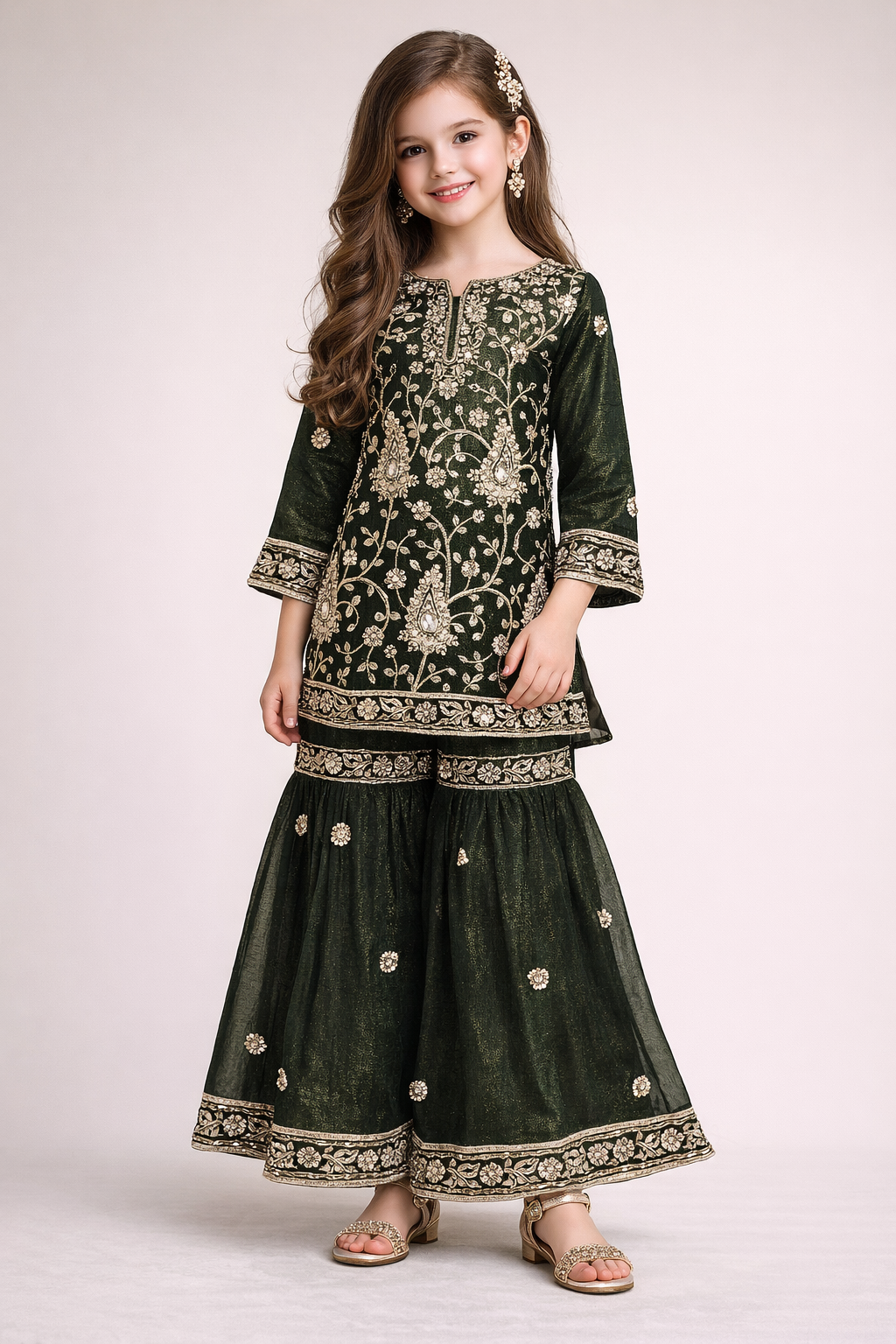 Make your little princess shine in timeless elegance with this stunning girls dark green embroidered kurti sharara set from House of IQF. Designed to blend traditional craftsmanship with modern comfort, this outfit is perfect for weddings, festivals, and grand celebrations.