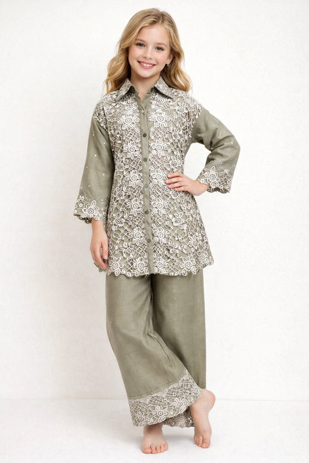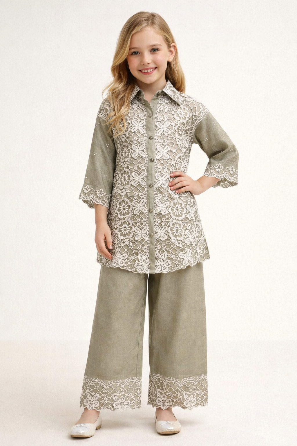 Perfect for festive gatherings, family functions, birthday parties, school events, and elegant casual wear, this girls co-ord set allows easy movement while keeping your child stylish and comfortable. The muted olive green tone paired with ivory lace makes it a timeless and versatile outfit.