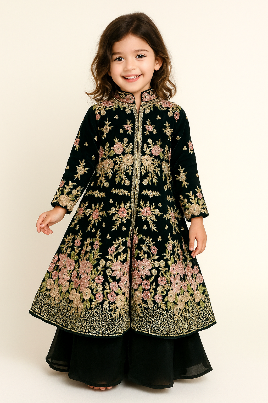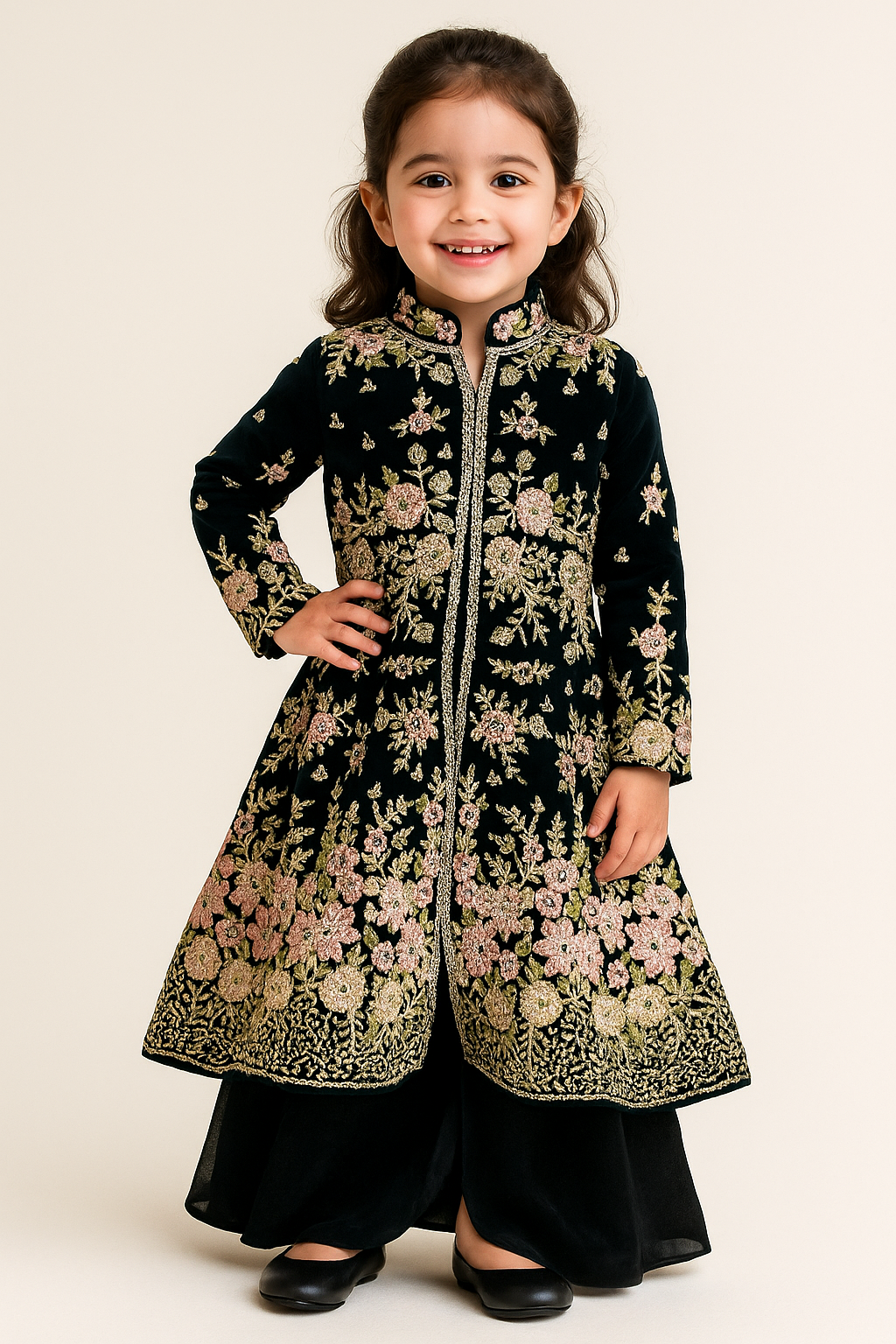 bring timeless elegance to your little one’s wardrobe with this Midnight Georgette Embroidered Anarkali Set from House of Iqf. Crafted in a rich black velvet base, this outfit is adorned with exquisite floral thread and sequin embroidery in shades of blush pink and gold. The long, front-open Anarkali silhouette paired with wide-legged bottoms creates a royal and sophisticated look — perfect for grand festive occasions and family celebrations.