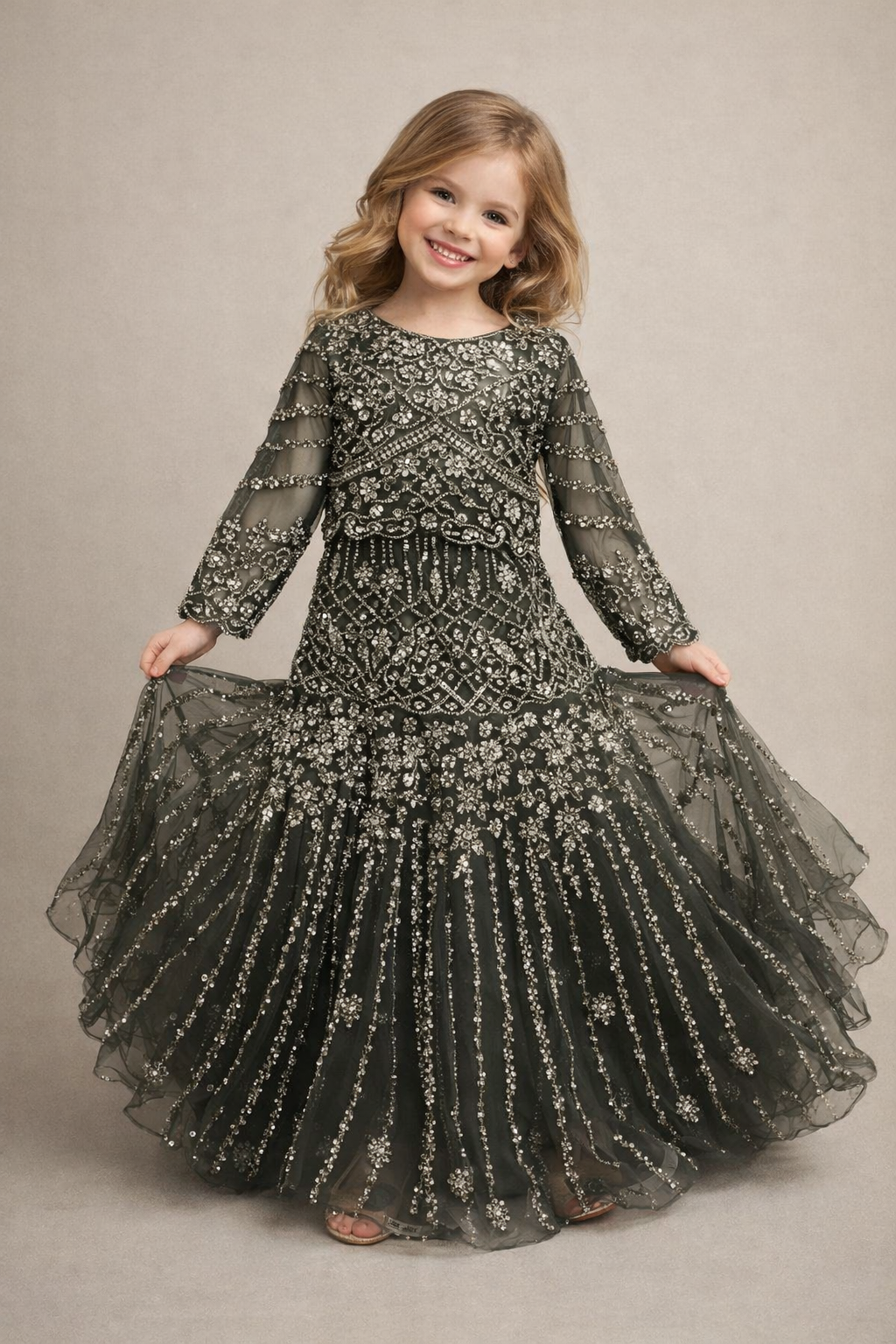Make your little princess shine at every celebration with this stunning dark green embellished net gown for girls from House of IQF. Designed for grand occasions, this outfit blends timeless elegance with modern luxury.