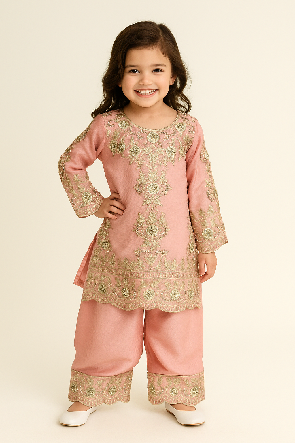 Make your little princess the star of every celebration with this Blush Pink Embroidered Kurti Set from House of IQF. Designed in a soft pastel hue, this outfit exudes elegance and charm — featuring exquisite golden thread embroidery across the neckline, sleeves, and borders for a royal festive look.