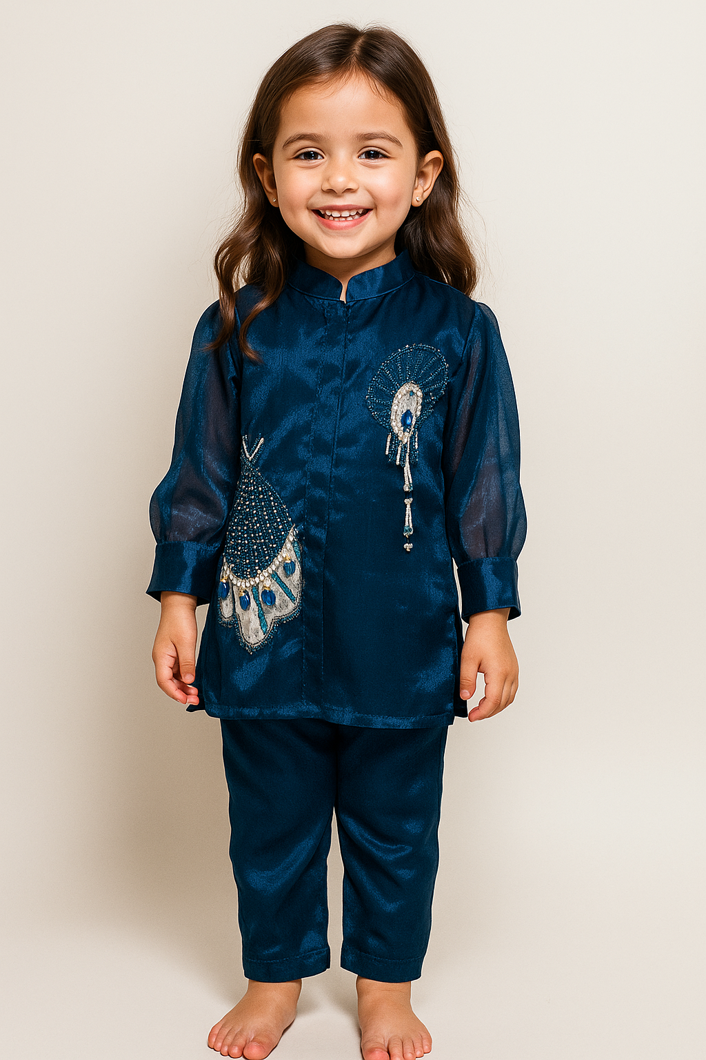 Let your little fashionista steal the spotlight with this luxurious Royal Blue Satin Co-ord Set, beautifully adorned with peacock embroidery. Designed for girls aged 1 to 4 years, this set includes a mandarin-collar top crafted in premium satin, featuring sheer puff sleeves with pearl buttons and graceful side slits. The detailed handwork of embroidered peacocks adds a regal charm that makes it perfect for festive and special occasions.